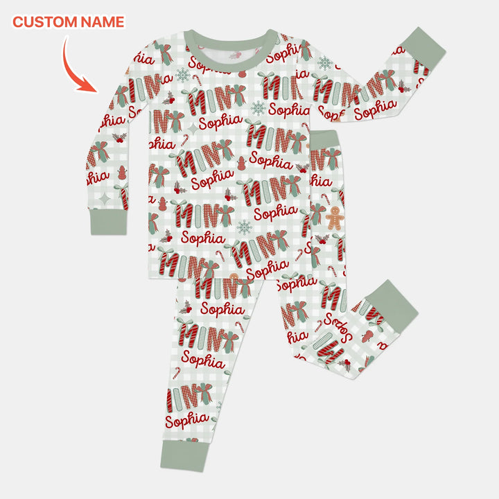 Custom Name Mama Mini Matching Christmas Two Piece Long Sleeve Pajama Set (Green)