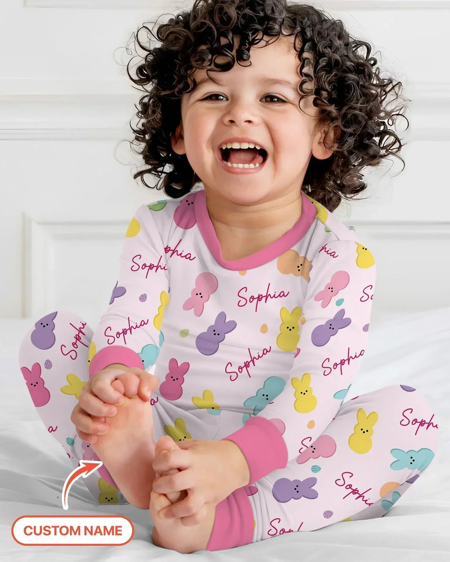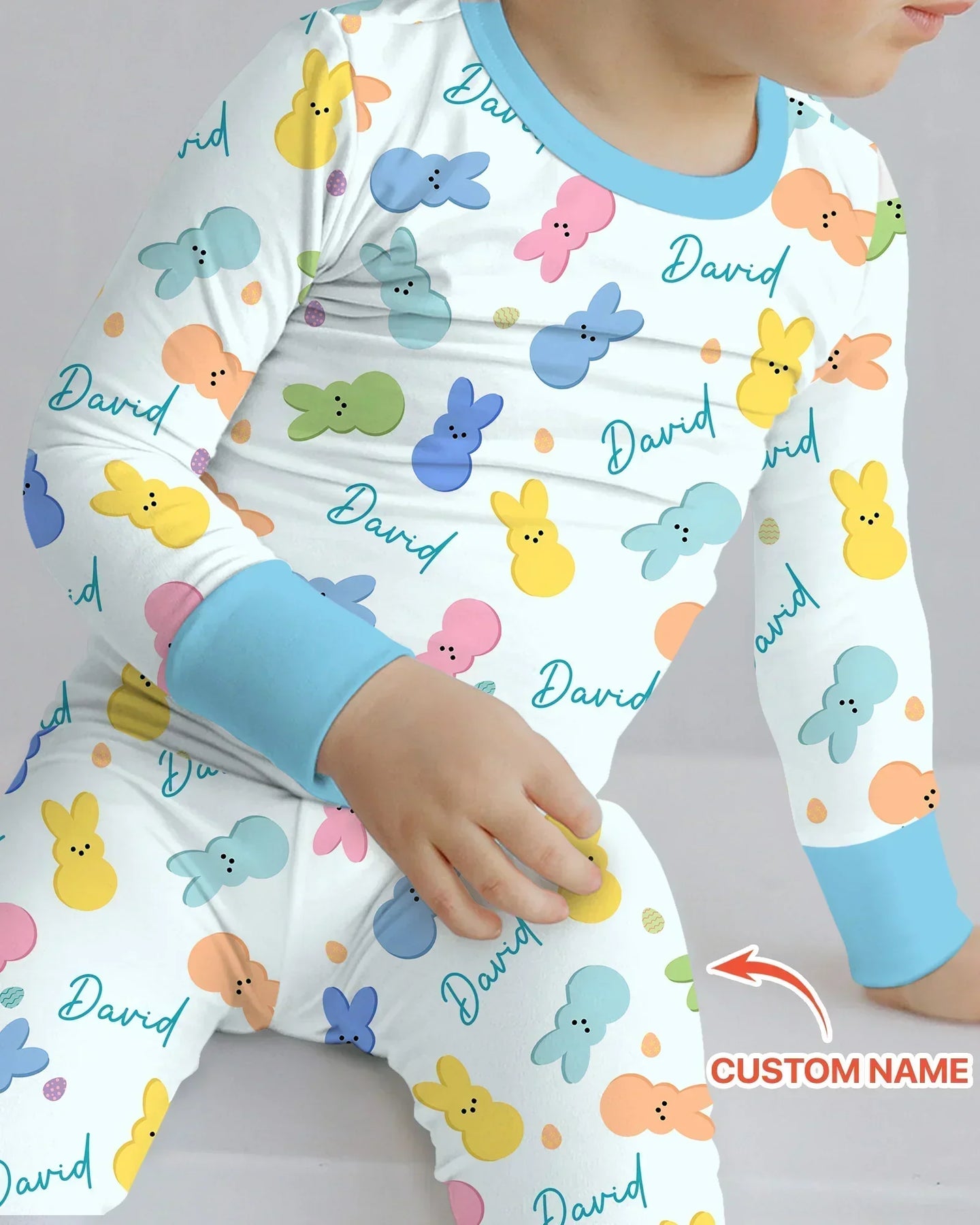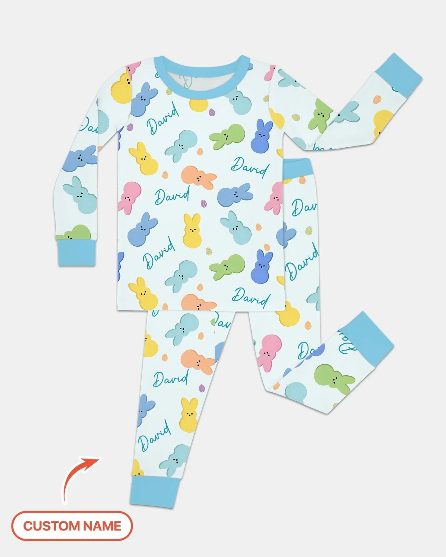 These Easter-themed zipper pajamas feature a playful bunny pattern with a personalized name scattered throughout, making each piece extra special. One design comes in soft pink tones for girls and fresh blue tones for boys, sharing the same cheerful artwork but styled to match each gender. Perfect for Easter mornings, springtime snuggles, and adorable family photos. 🐰🌸💙