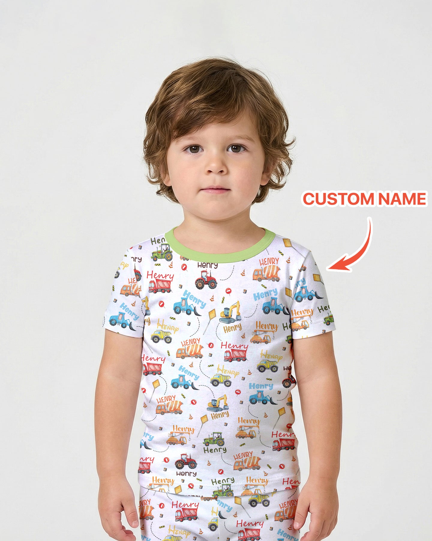 Construction Vehicles Custom Name Two Piece Short Sleeve Pajama Set