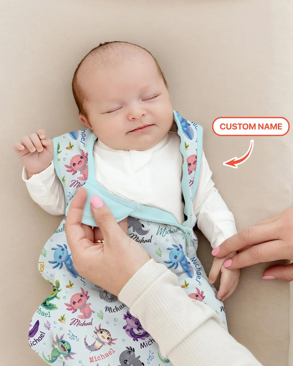 Add your child’s custom name for a personal touch that makes each piece uniquely theirs. The cute swimming axolotls, soft pastel tones, and gentle ocean elements create a sweet, whimsical world perfect for babies and toddlers.