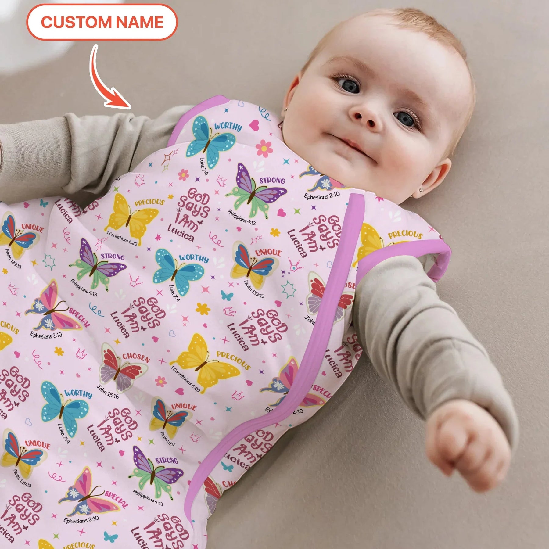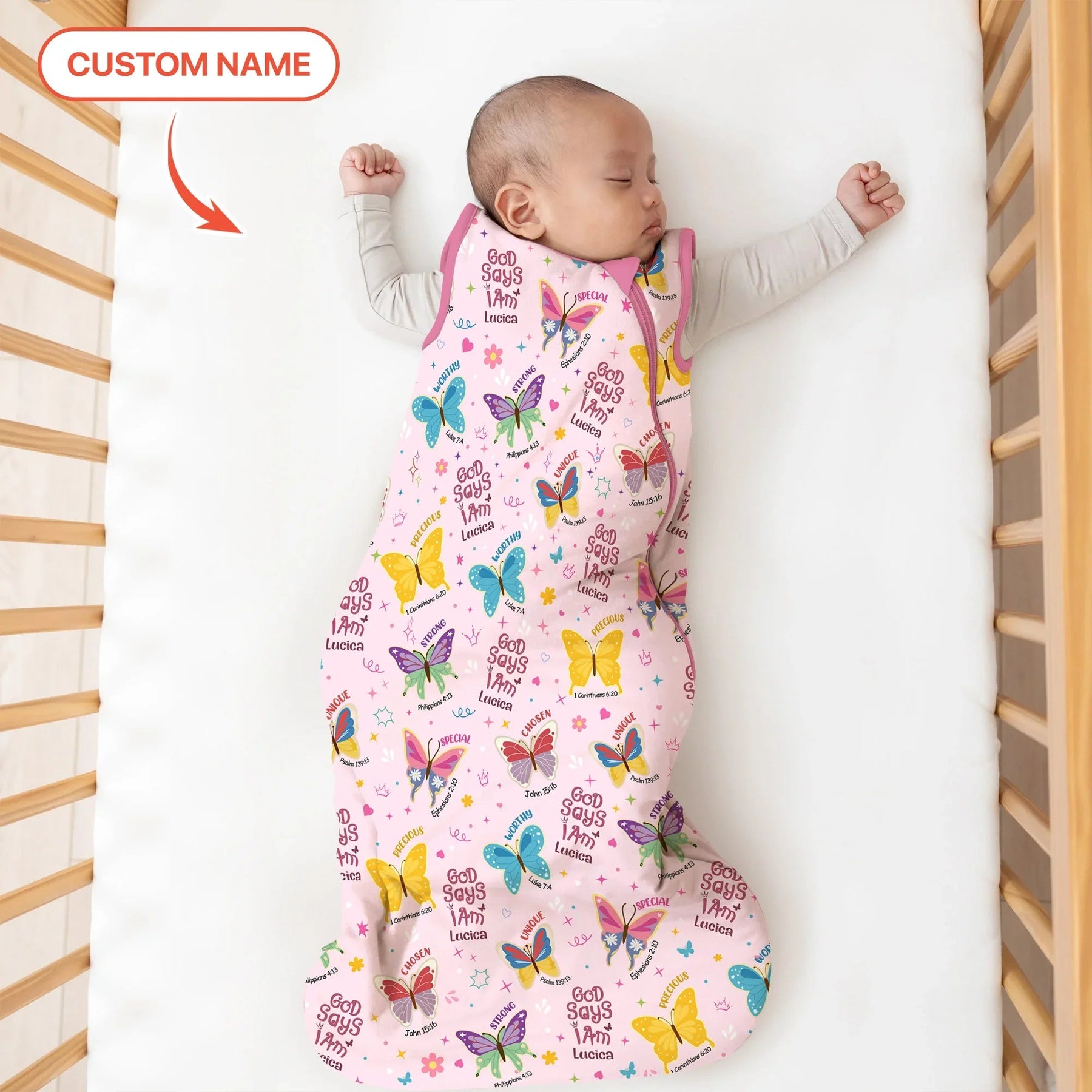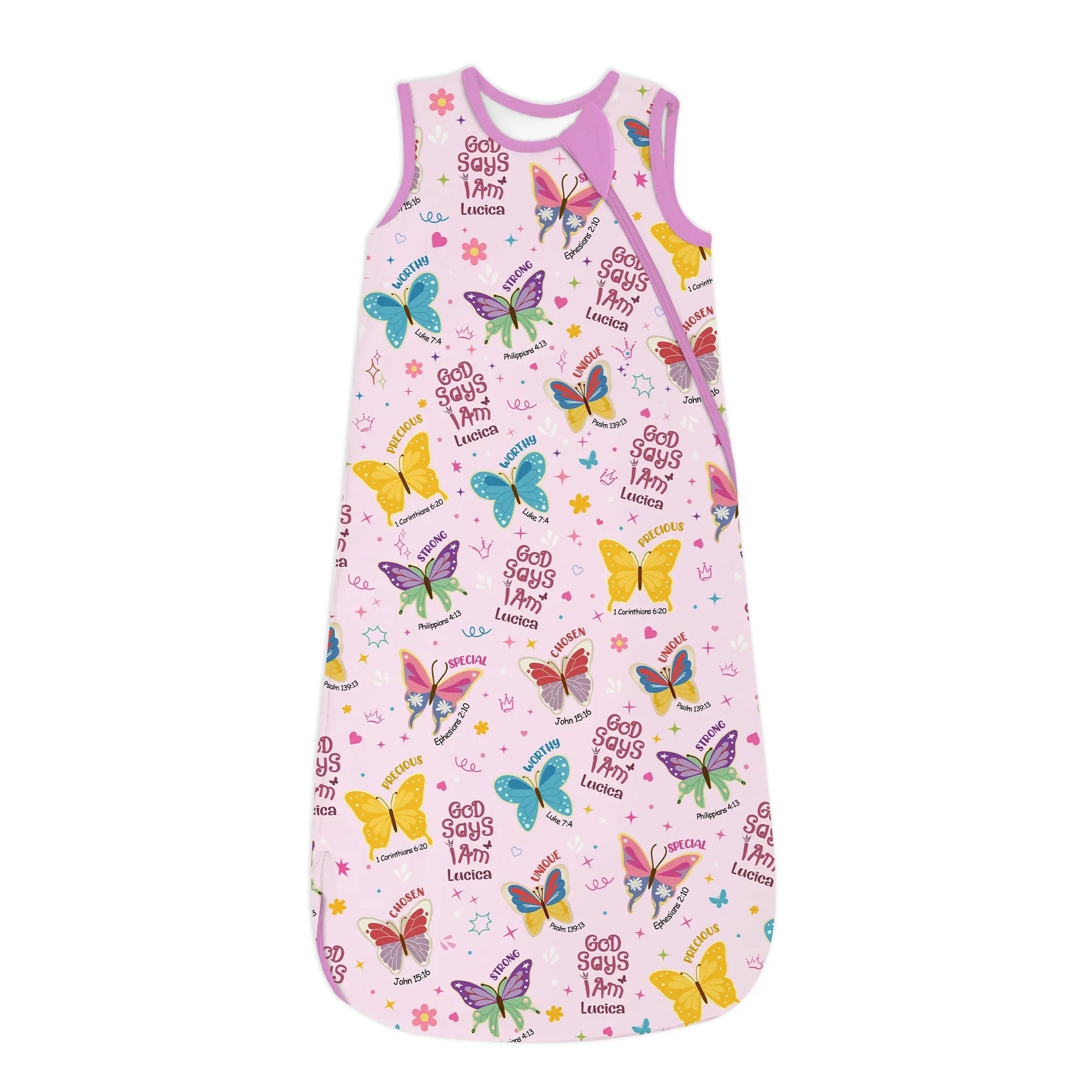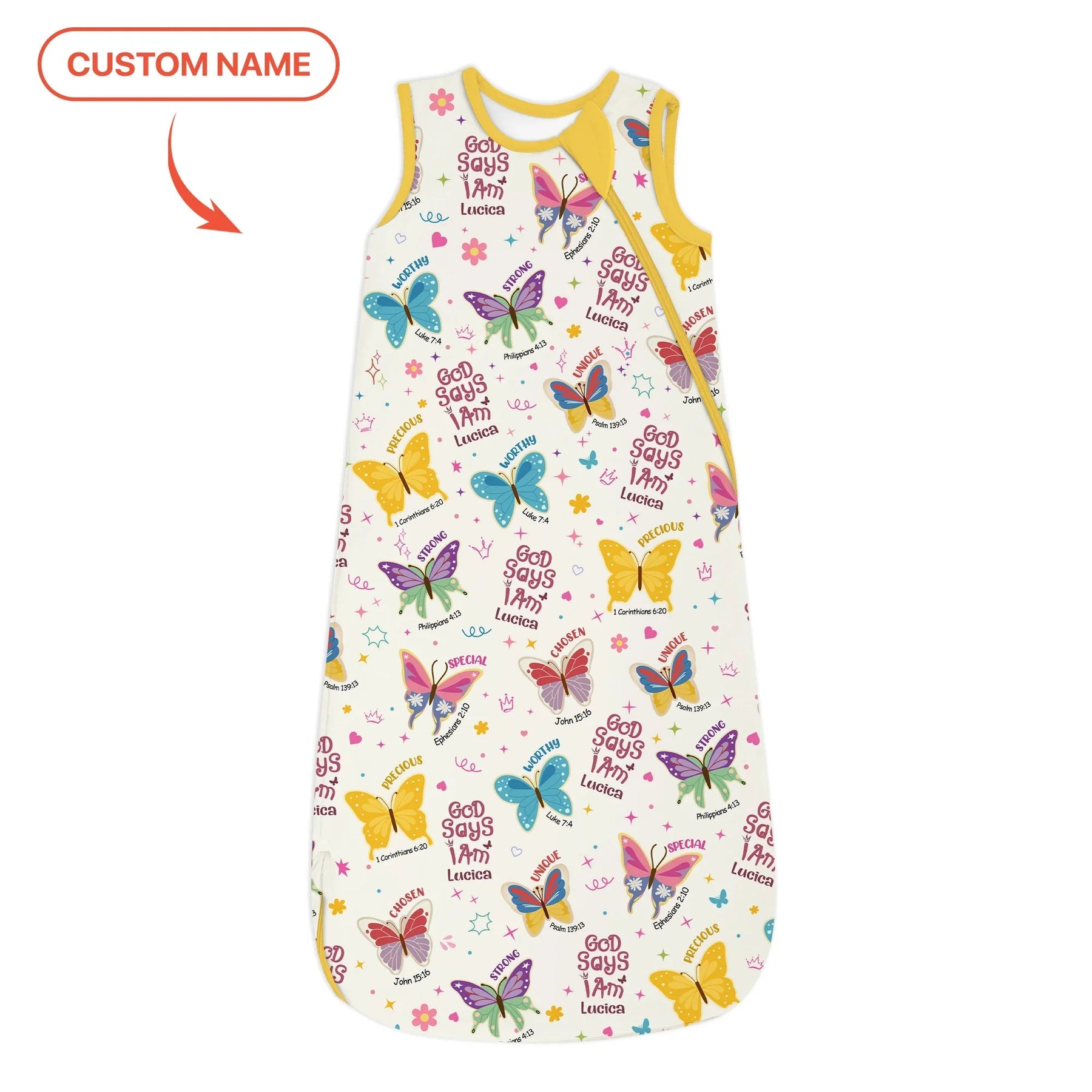 Lassen Sie Ihren Glauben mit unserem „God Says I Am“-Schmetterlings-Zippy fliegen! Verziert mit bunten Schmetterlingen und erhebenden Bibelsprüchen wie „Stark“, „Auserwählt“, „Wertvoll“, „Würdig“, „Besonders“ und „Einzigartig“ erinnert dieses Design an die von Gott gegebene Schönheit und Stärke jedes Kindes. Personalisieren Sie es mit dem Namen Ihres Kindes für ein einzigartiges Andenken! Hergestellt aus ultraweichem, atmungsaktivem Bambusgewebe, ist dieses langärmlige Zippy perfekt für Spielabenteuer, gemütliche Nickerchen und Kuscheln vor dem Schlafengehen – das ganze Jahr über.