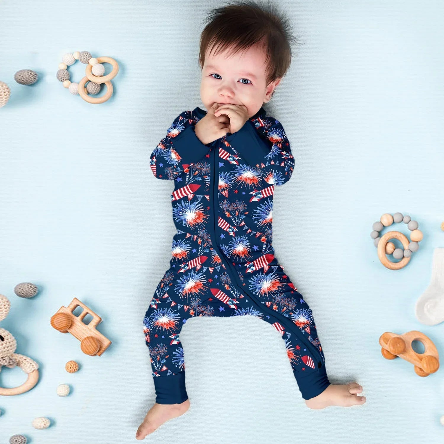 Dieser aus speziell gefrästem Bambus gefertigte Strampler mit festlichem 4. Juli-Muster ist weich und atmungsaktiv und perfekt für empfindliche Haut. Die umklappbaren Fußbündchen lassen sich leicht von Fußlos auf Fuß umstellen, und der Doppelreißverschluss ermöglicht schnelles Windelwechseln – ideal für eine bequeme und stilvolle Feier.
