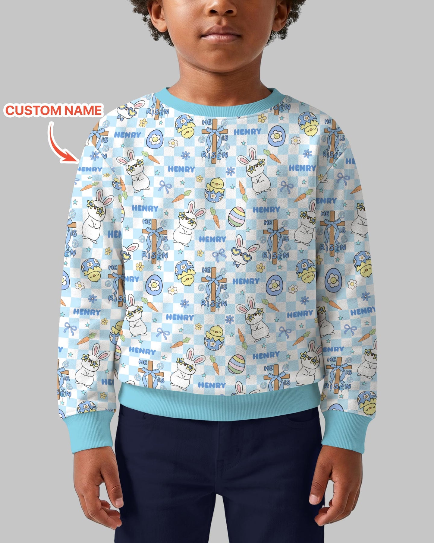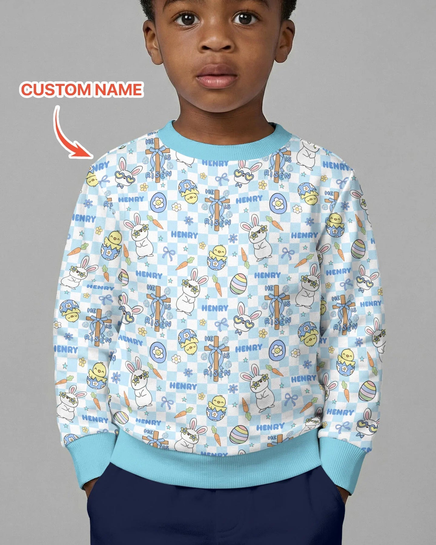 This charming pattern mixes vintage Easter vibes with sweet bunnies, eggs, bows, and crosses alongside the uplifting message “He Is Risen,” all personalized with your child’s name. Made from our signature buttery-soft, breathable bamboo fabric, these pajamas keep little ones comfy day and night while celebrating the joy of Easter. Perfect for Easter morning, church days, family photos, and cozy spring nights 💙✨