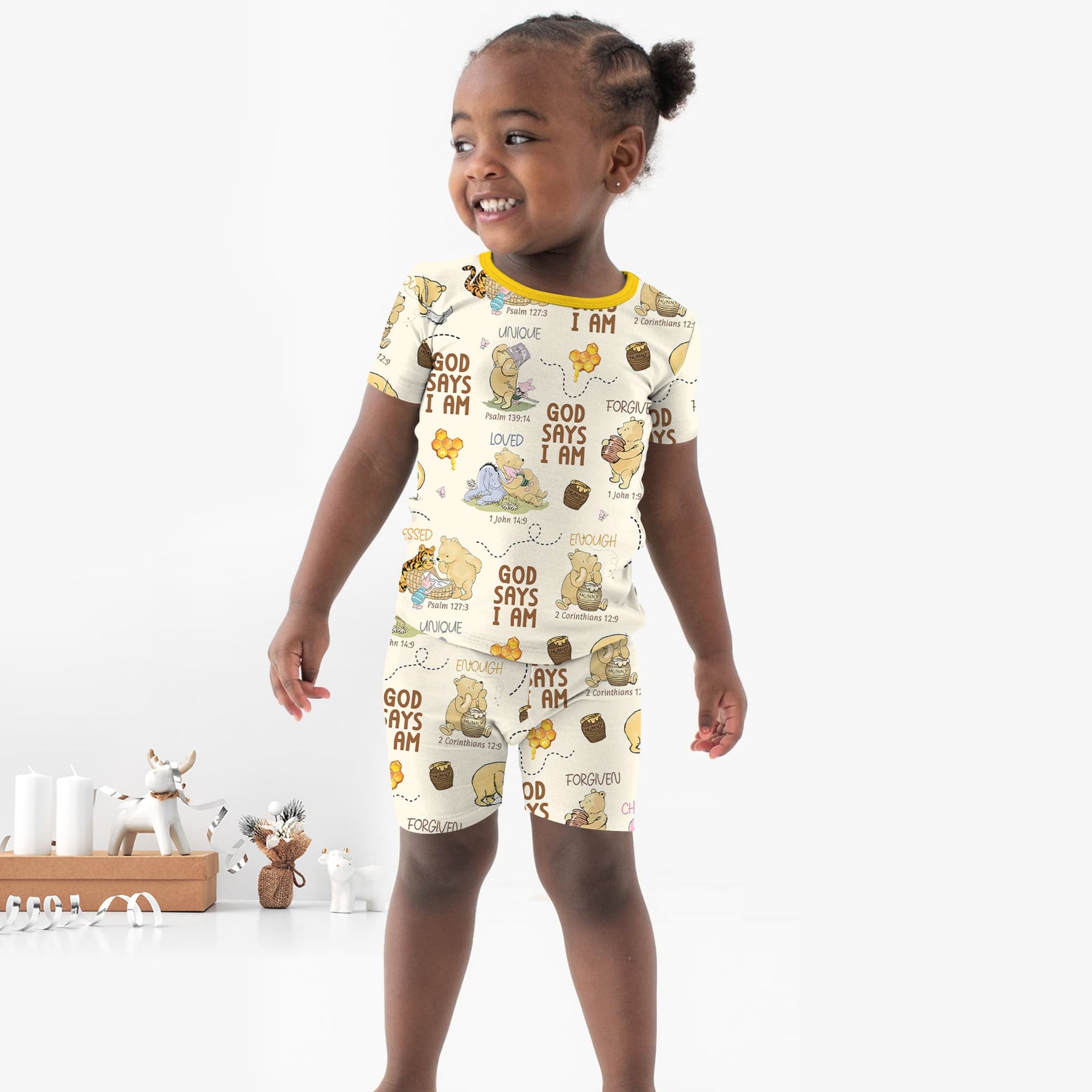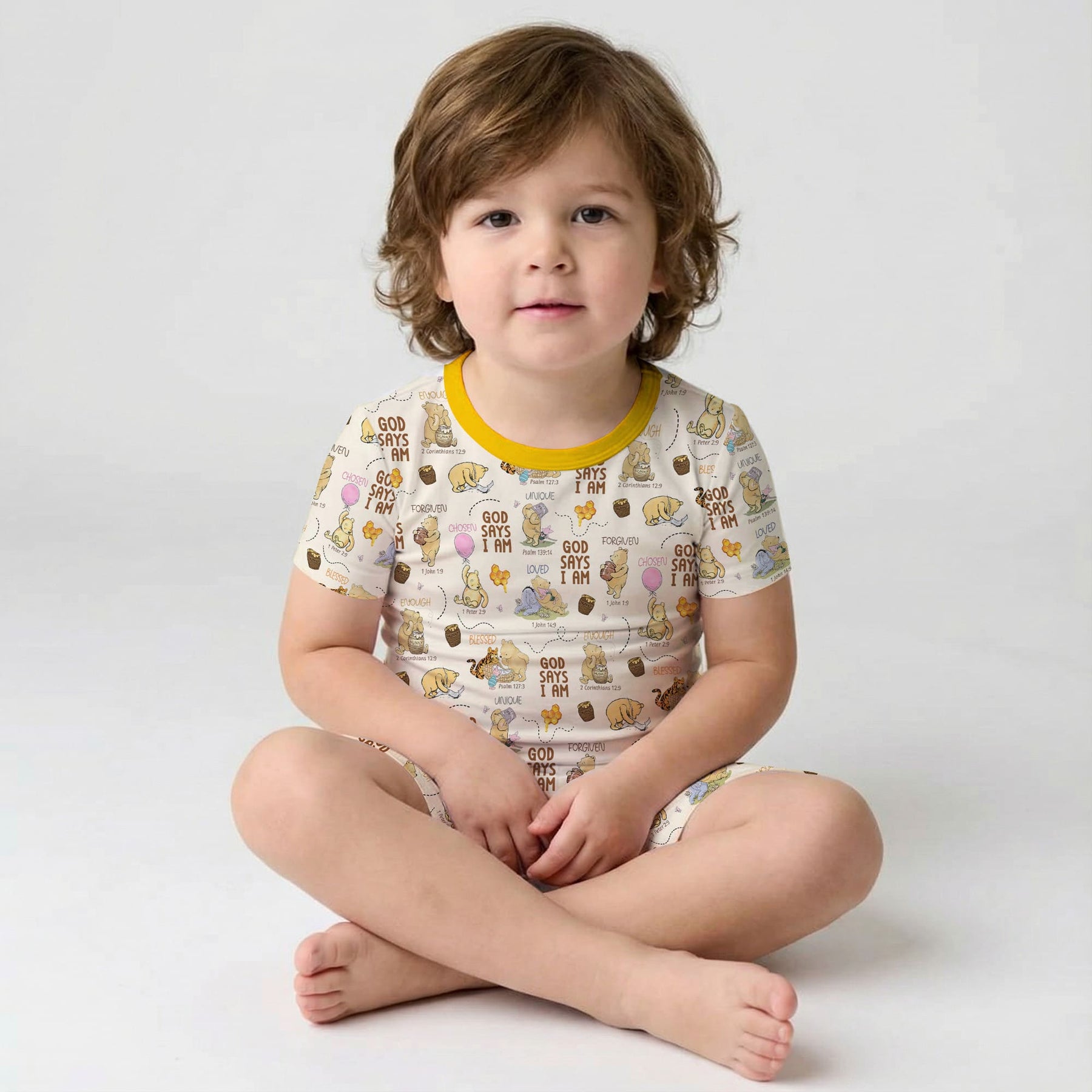 This design showcases an all-over illustration of Pooh and his friends in sweet, storybook moments on a light yellow checkered background, highlighting their good-natured personalities and creating a cozy, cheerful feeling. Crafted from soft bamboo viscose, this set is gentle on sensitive skin and offers breathable comfort in any season. The extra length ensures it fits longer, making bedtime routines even more enjoyable.