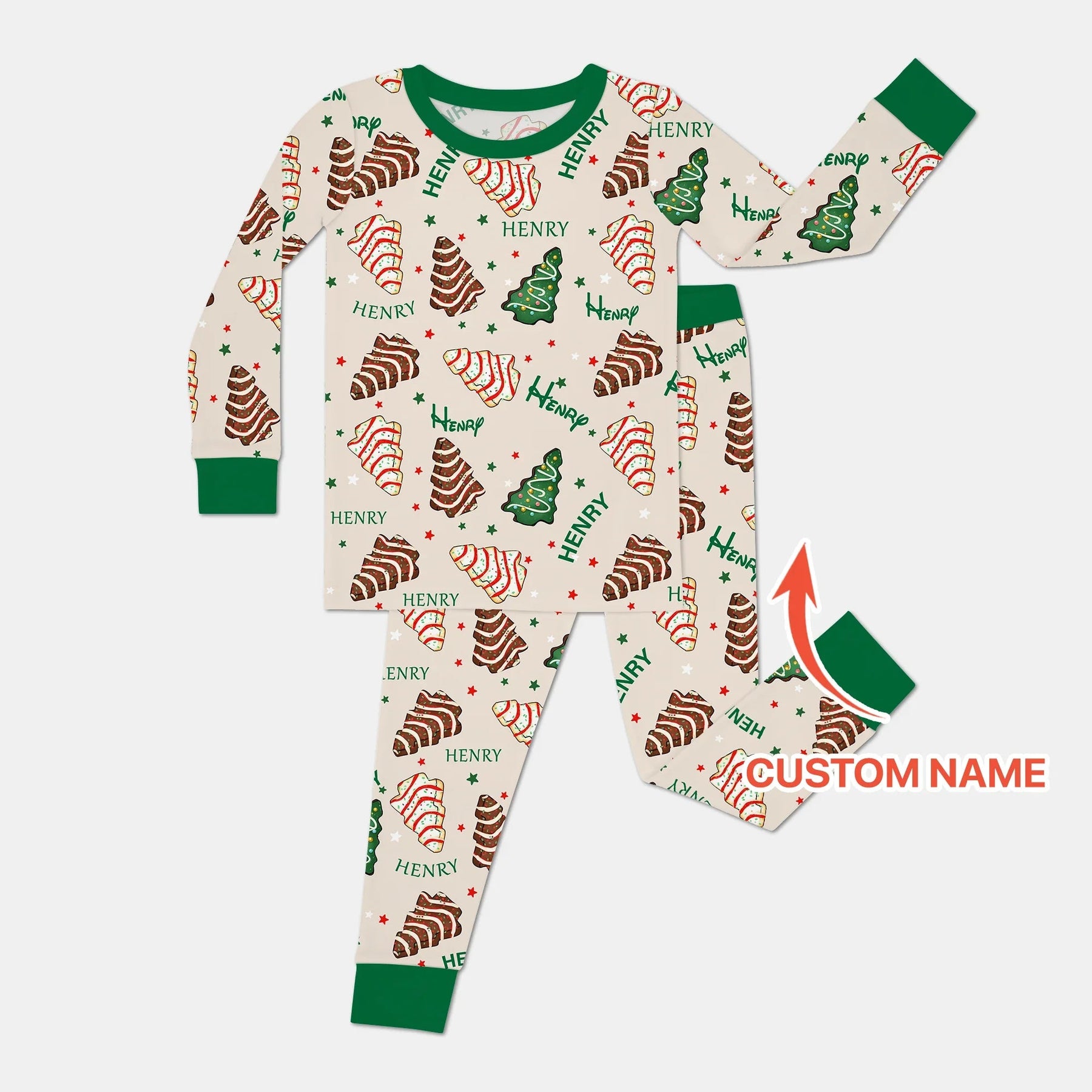 Christmas Tree Cake Custom Name Two Piece Long Sleeve Pajama Set - Zumbamboo