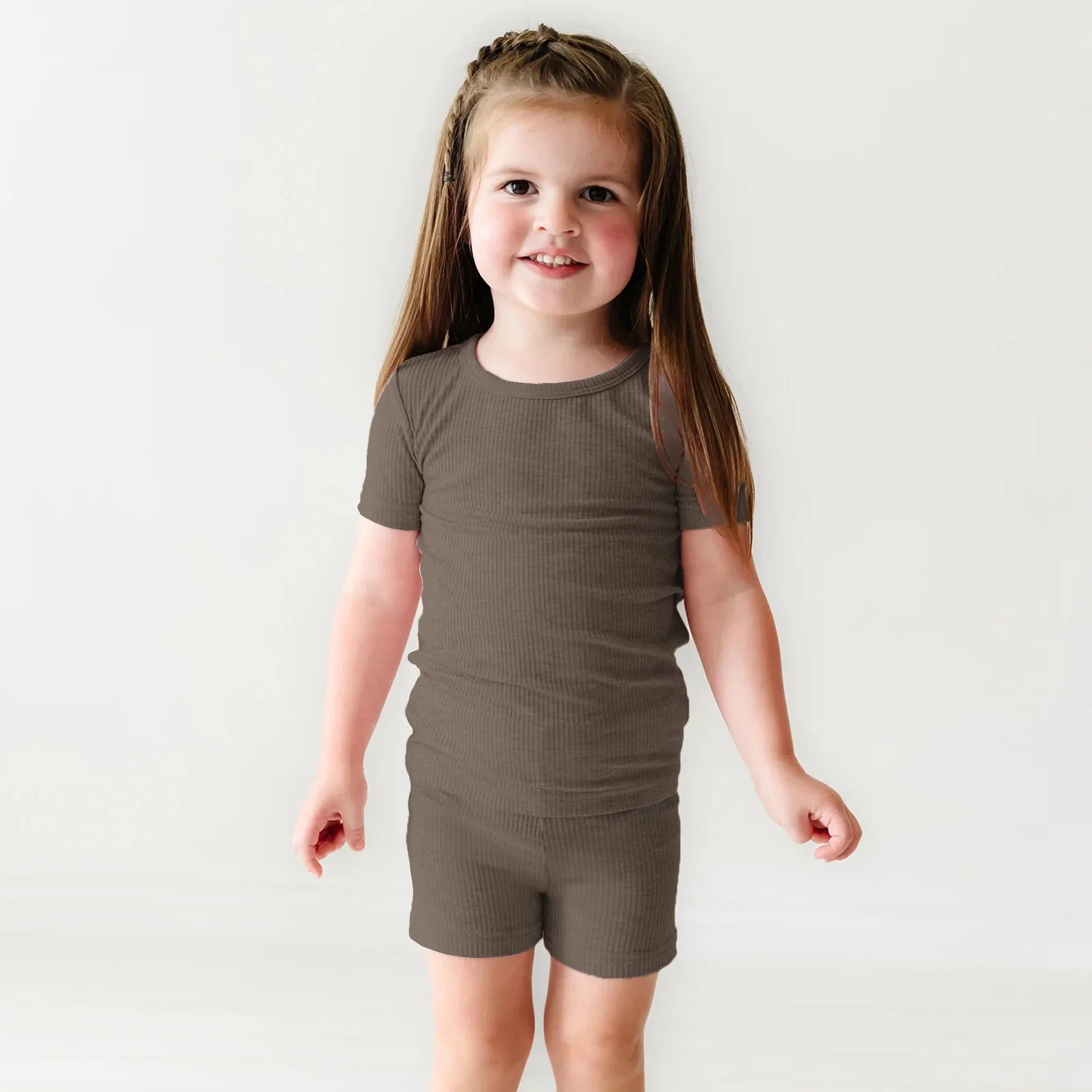Zweiteiliges, geripptes Pyjama-Set mit kurzen Ärmeln und Shorts in Kakao