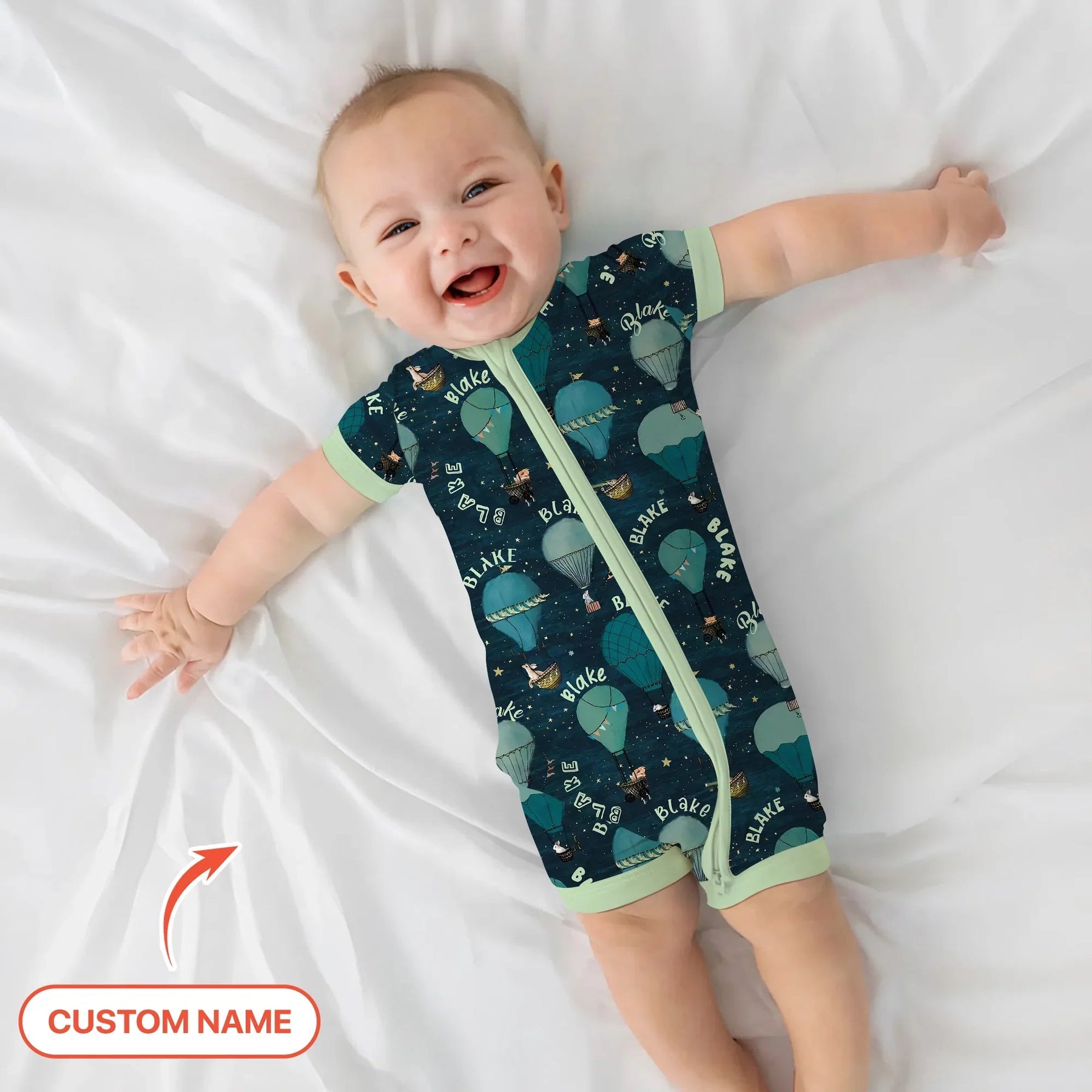 Nehmen Sie Ihren Kleinen mit auf ein traumhaftes Abenteuer mit unseren Heißluftballon-Zippies und Pyjamas mit individuellem Namen. Diese kuscheligen Essentials aus seidig-weichem Bambusstoff können mit dem Namen Ihres Kindes personalisiert werden – perfekt für süße Träume und kuschelige Stunden in luftiger Höhe.