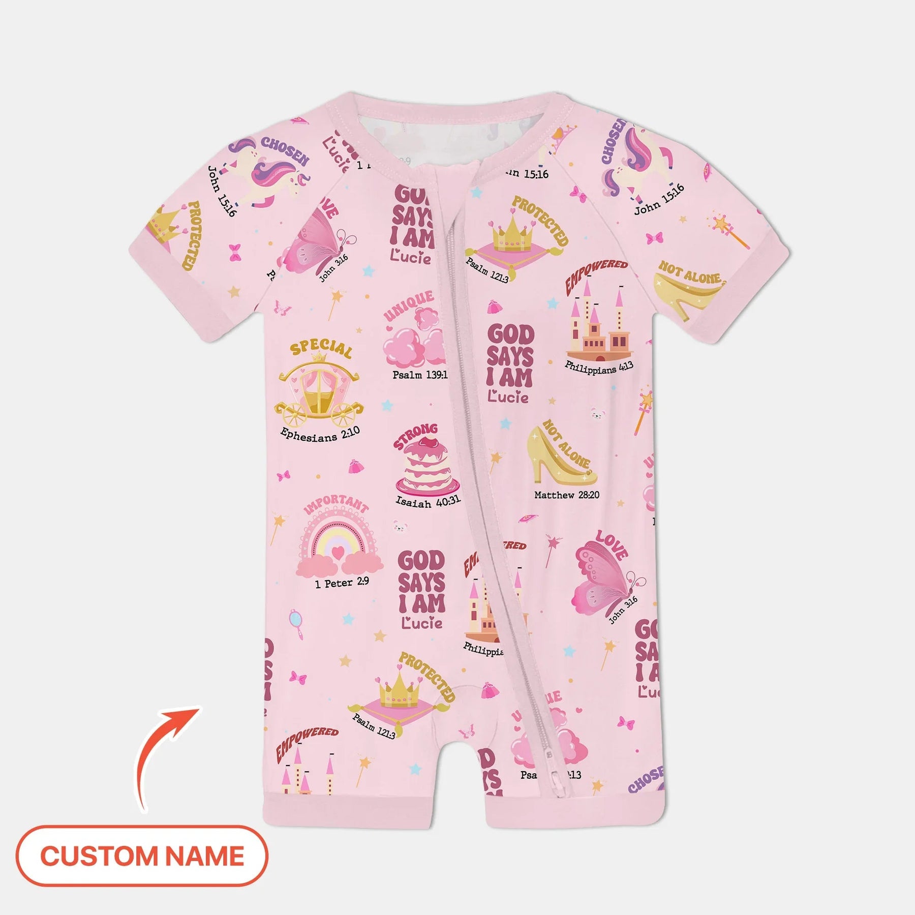 Machen Sie einen Spritzer Glauben und Spaß mit unserem „Gott sagt, ich bin“ – Prinzessinnen-Kollektion! Mit Kronen, Schlössern, Regenbögen und funkelnden Details ist dieses bezaubernde Design voller Affirmationen, die kleine Mädchen daran erinnern, dass sie in Gottes Augen wertvoll, stark und einzigartig sind. Fügen Sie ihren Namen hinzu, um jedem Stück eine persönliche Note zu verleihen und es zu einem einzigartigen Schatz zu machen. Diese Kollektion aus ultraweichem, atmungsaktivem Bambusgewebe ist sanft zur Haut – perfekt für Spielabenteuer, gemütliche Nächte und jedes kuschelige Kuscheln zwischendurch.