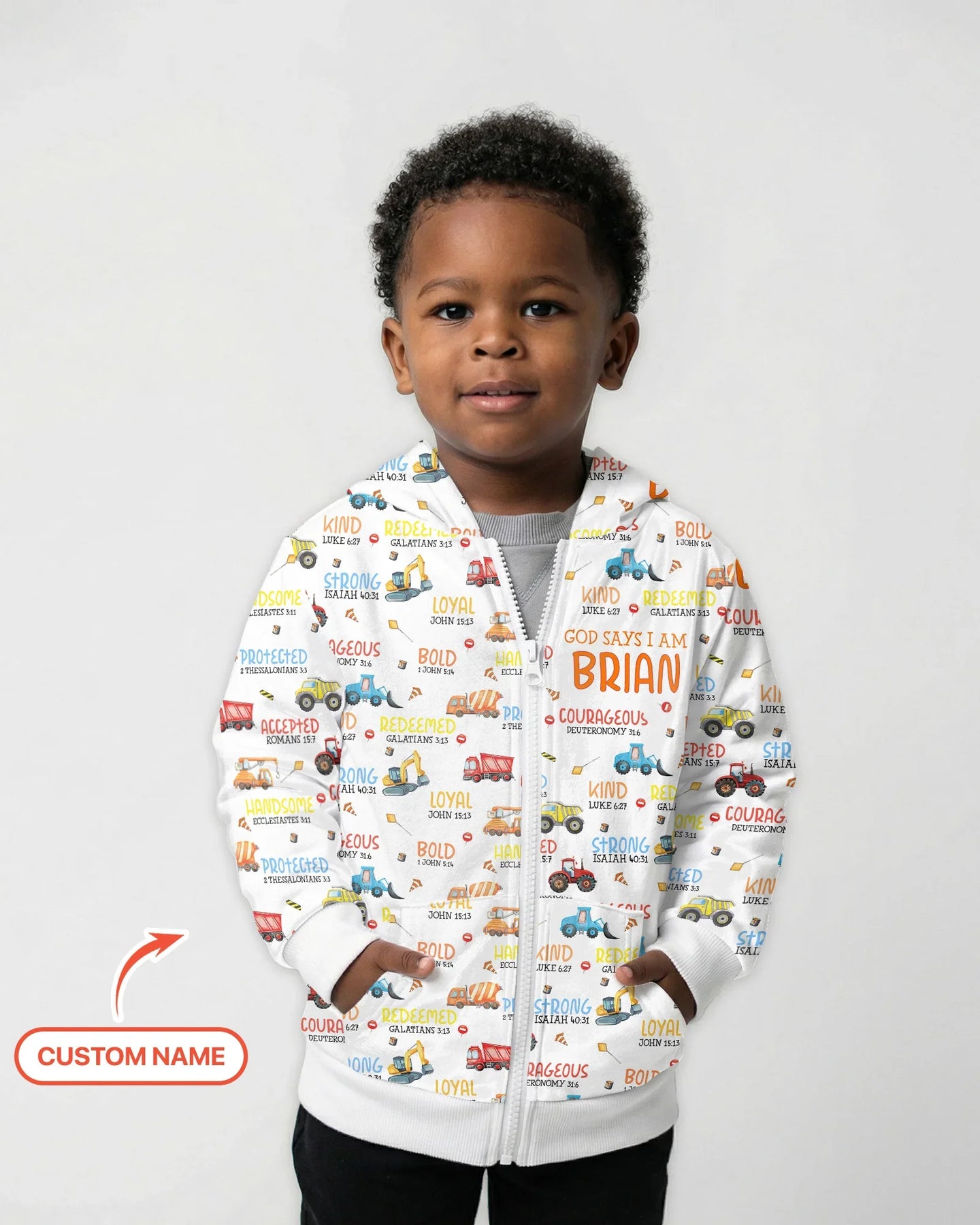 Built for little hands and big faith, the Personalized “God Says I Am – Little Builder” collection combines construction-themed fun with powerful Christian affirmations. Featuring colorful trucks, tractors, and building vehicles alongside uplifting words like Strong, Courageous, Kind, Protected, Accepted, and Redeemed, each piece reminds your child who they are in God’s eyes.
