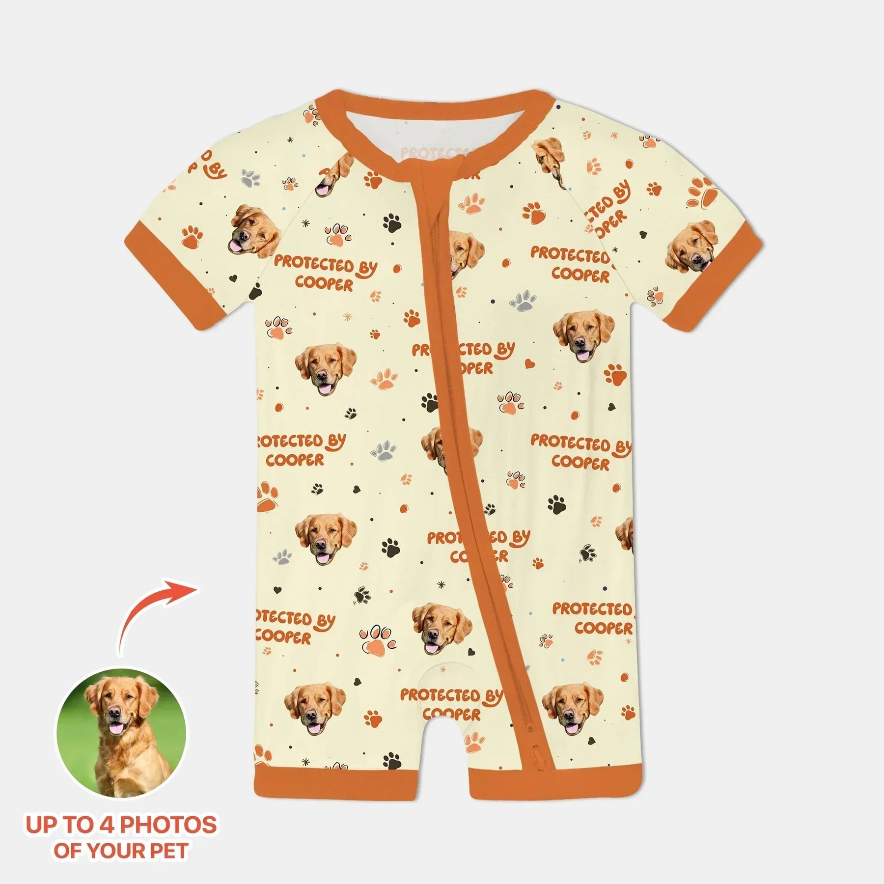 Halten Sie Ihren kleinen Liebling mit unseren Bambus-Reißverschlüssen und -Schlafanzügen „Custom Dog Photos 'Protected By' Pawfect“ warm und geschützt. Hergestellt aus luxuriös weichem, atmungsaktivem Bambusstoff, können diese Schlafanzüge mit bis zu vier Fotos Ihres Hundes personalisiert werden. Mit verspielten Pfotenabdrücken und dem Gesicht Ihres Hundes sind sie sanft zu empfindlicher Haut, dehnbar für Komfort die ganze Nacht und die perfekte Möglichkeit, Kuscheln und Liebe für Ihren pelzigen Freund zu verbinden.