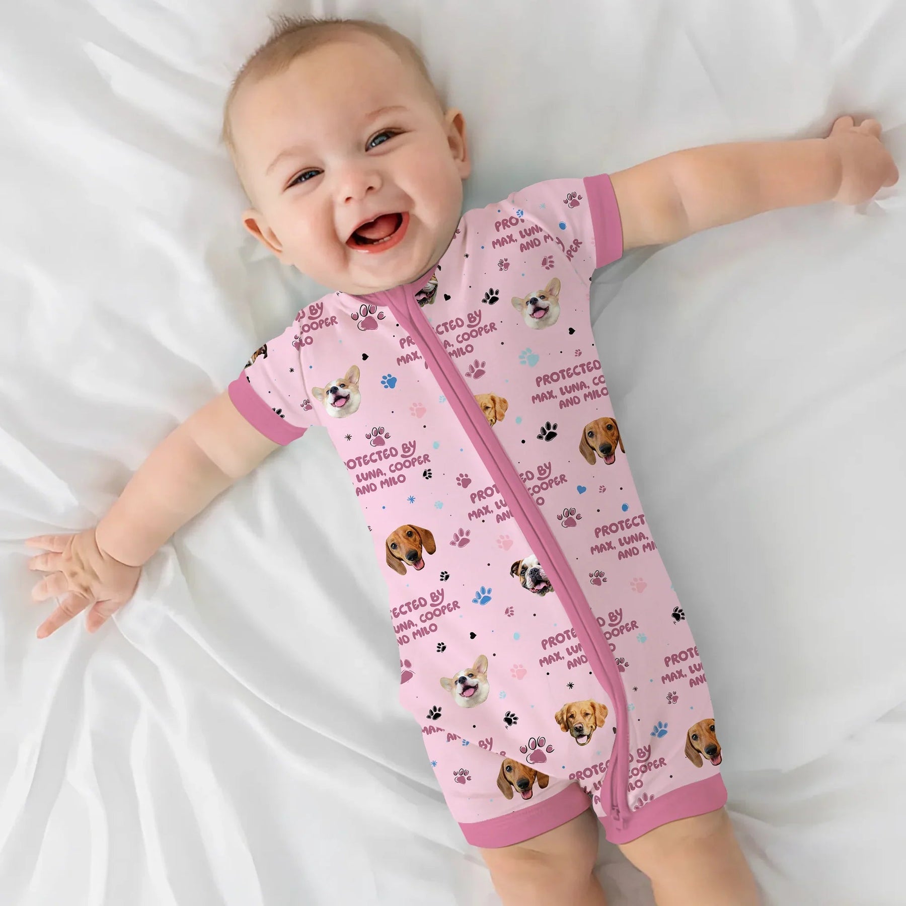 Halten Sie Ihren kleinen Liebling mit unseren Bambus-Reißverschlüssen und -Schlafanzügen „Custom Dog Photos 'Protected By' Pawfect“ warm und geschützt. Hergestellt aus luxuriös weichem, atmungsaktivem Bambusstoff, können diese Schlafanzüge mit bis zu vier Fotos Ihres Hundes personalisiert werden. Mit verspielten Pfotenabdrücken und dem Gesicht Ihres Hundes sind sie sanft zu empfindlicher Haut, dehnbar für Komfort die ganze Nacht und die perfekte Möglichkeit, Kuscheln und Liebe für Ihren pelzigen Freund zu verbinden.
