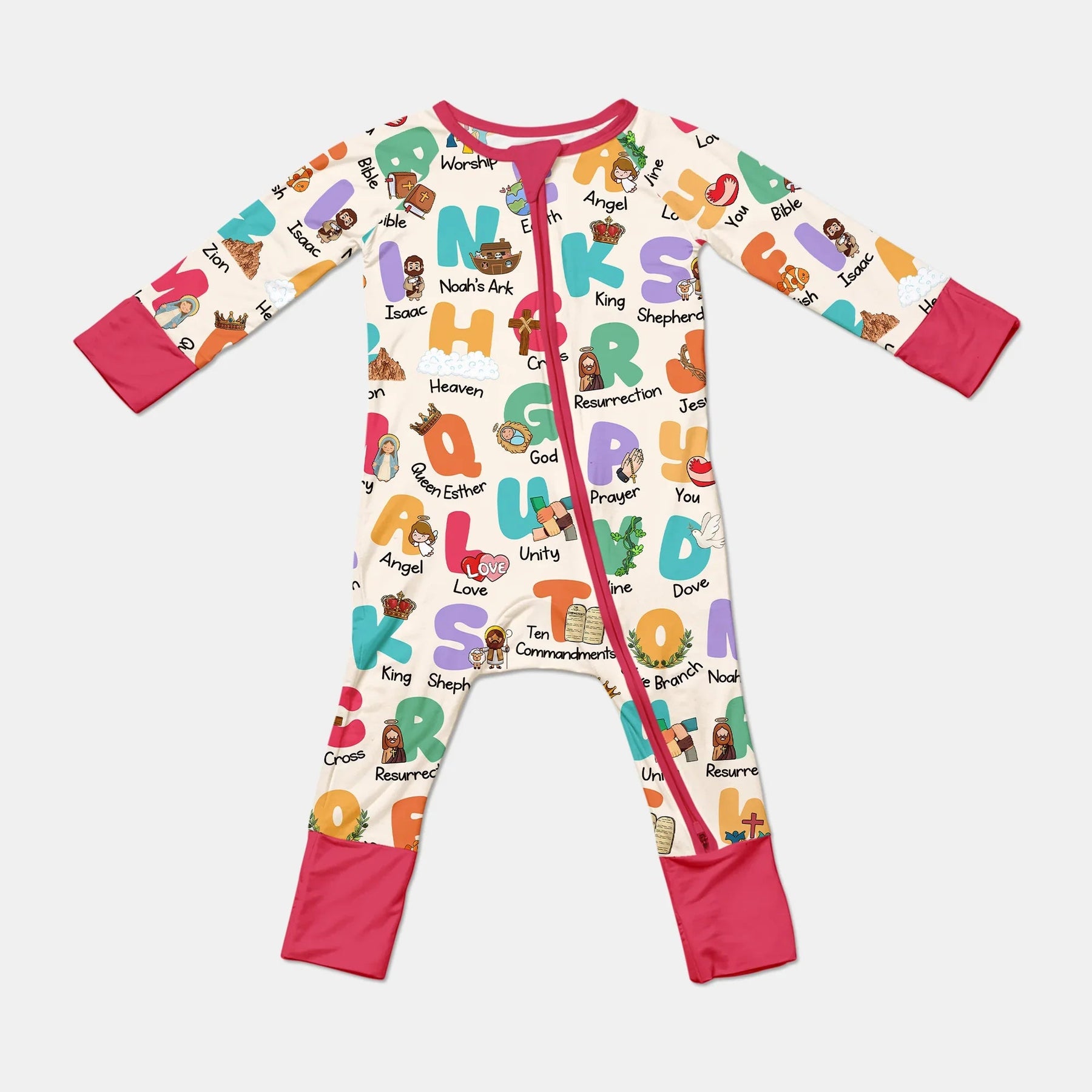 Bringen Sie mit unserer biblischen Alphabet-Kollektion Glauben und Spaß in die Schlafenszeit! Jeder Buchstabe des Alphabets ist mit einem bedeutungsvollen Bibelwort oder -symbol verknüpft – von A für Engel bis Z für Zion – und hilft den Kleinen beim Lernen, während sie gemütlich eingehüllt sind. Dieser Pyjama aus ultraweichem, atmungsaktivem Bambusgewebe ist sanft zu empfindlicher Haut und perfekt für gemütliche Nächte, zum Vorlesen oder für den Sonntagmorgen. Fügen Sie Ihren Namen hinzu – für eine süße, persönliche Note, die das Lernen von Gottes Wort noch besonderer macht.