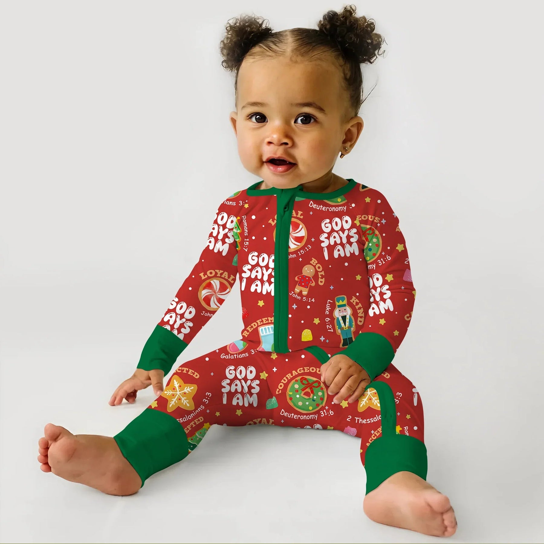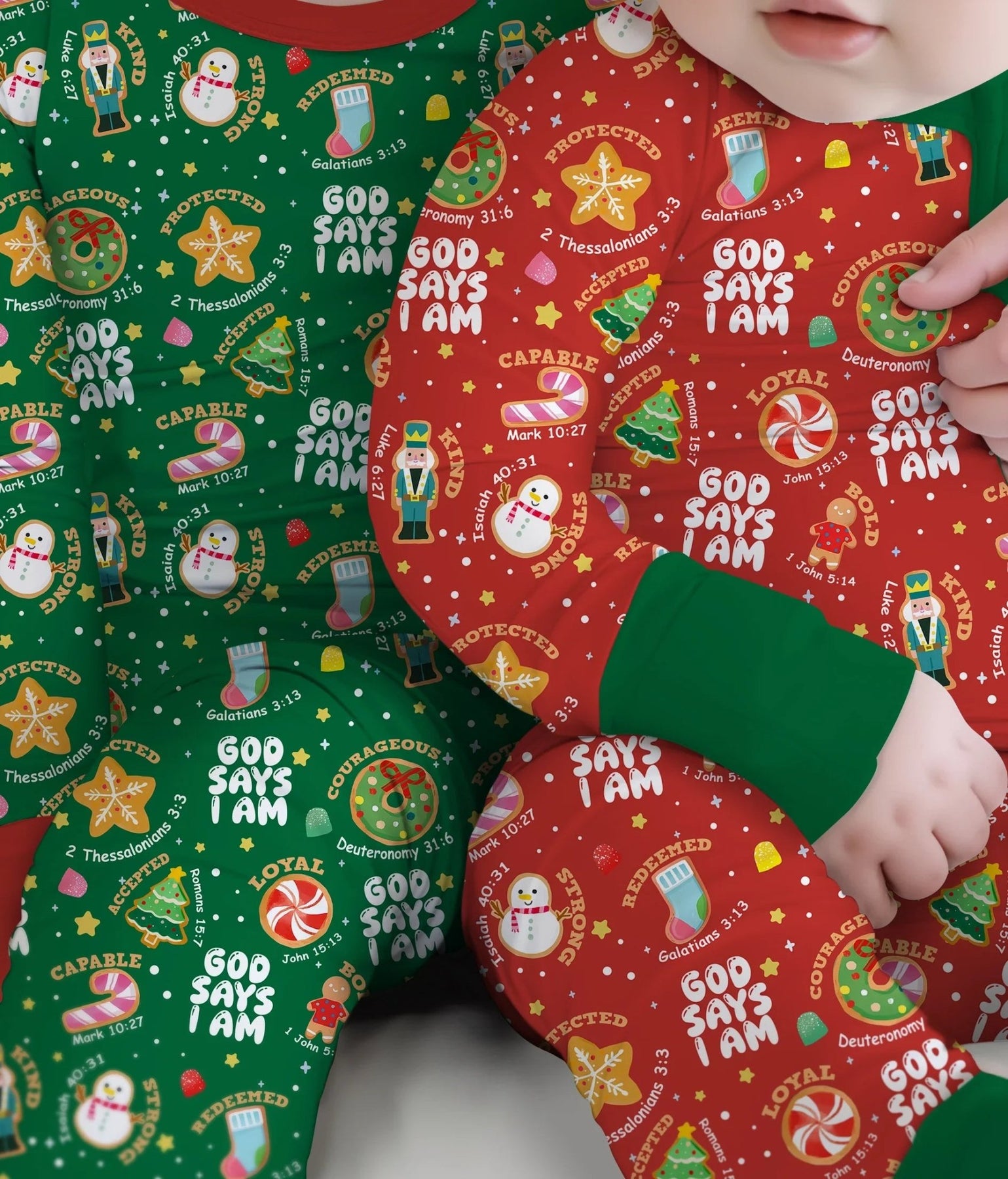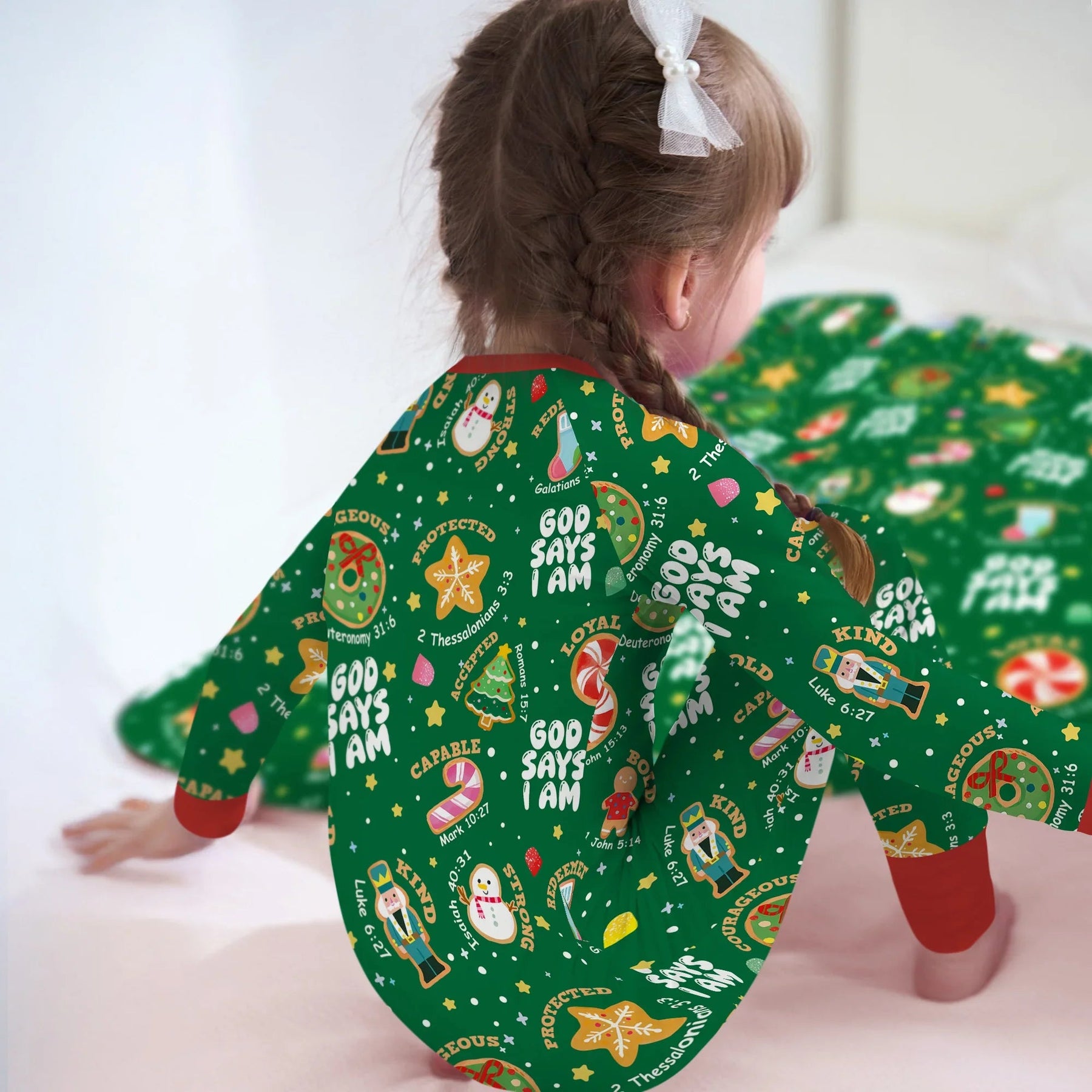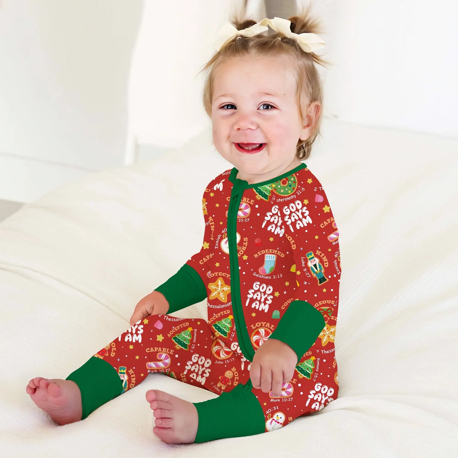 Feiern Sie die Weihnachtsfreude mit unserer „Merry Christmas God Says I Am“-Kollektion! Verziert mit festlichen Nussknackern, Zuckerstangen, Lebkuchen und Süßigkeiten ist jedes Stück mit Glaubensbekenntnissen bestreut, um die Kleinen an ihre wahre Identität in Gottes Augen zu erinnern. Dieser Pyjama aus butterweichem, atmungsaktivem Bambusgewebe hält Ihr Kind bei jedem Weihnachtslied, jeder Kuscheleinheit und jeder Überraschung am Weihnachtsmorgen warm. Fügen Sie Ihren Namen hinzu, um Ihren Weihnachtstraditionen eine persönliche Note zu verleihen und sie noch bedeutungsvoller zu machen.