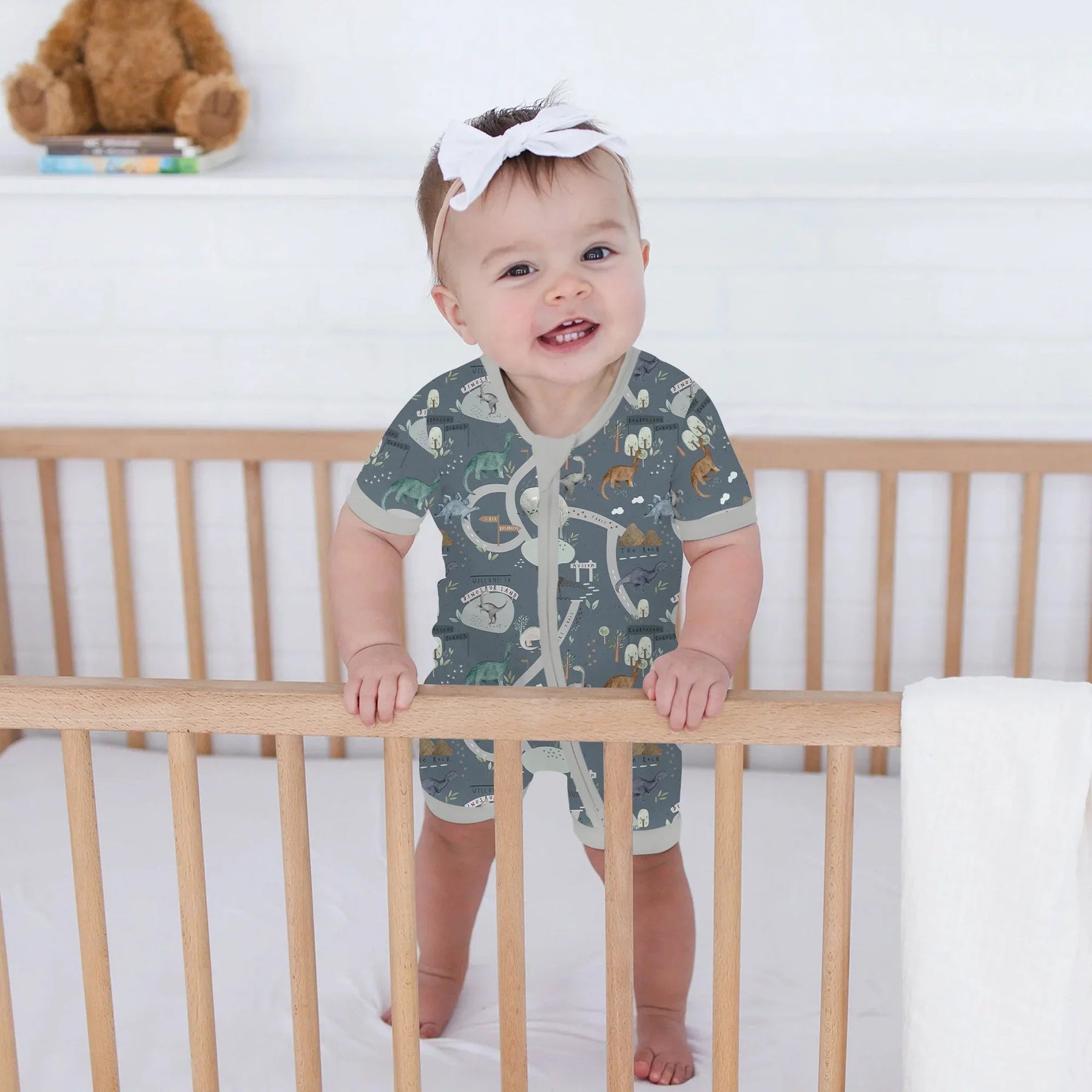 Abenteuer erwarten Sie mit unseren Bambus-Zippies und Schlafanzügen „Dinosaurier-Routenkarte“. Hergestellt aus luxuriös weichem, atmungsaktivem Bambusstoff, halten diese Schlafanzüge kleine Entdecker zu jeder Jahreszeit gemütlich. Das verspielte Kartendesign mit niedlichen Dinosauriern und malerischen Routen regt die Fantasie an und lädt zum Geschichtenerzählen ein. Sanft zu empfindlicher Haut, dehnbar für Komfort die ganze Nacht – perfekt für Dino-Liebhaber.