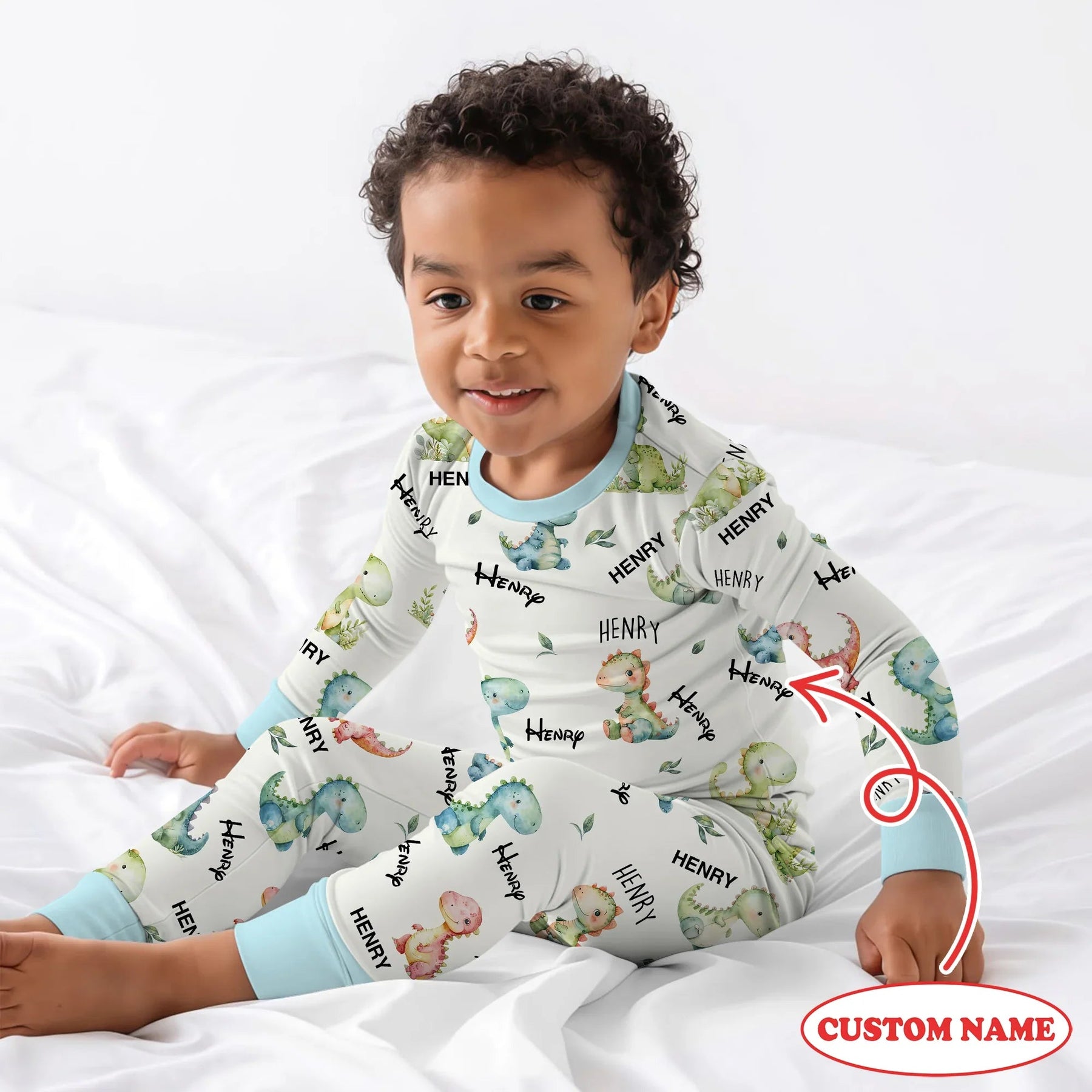 Dinosaur Custom Name Two Piece Long Sleeve Pajama Set - Zumbamboo