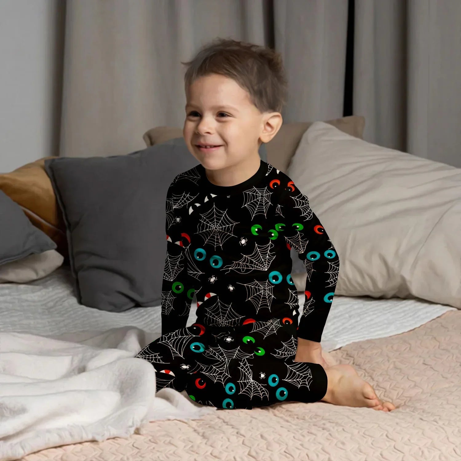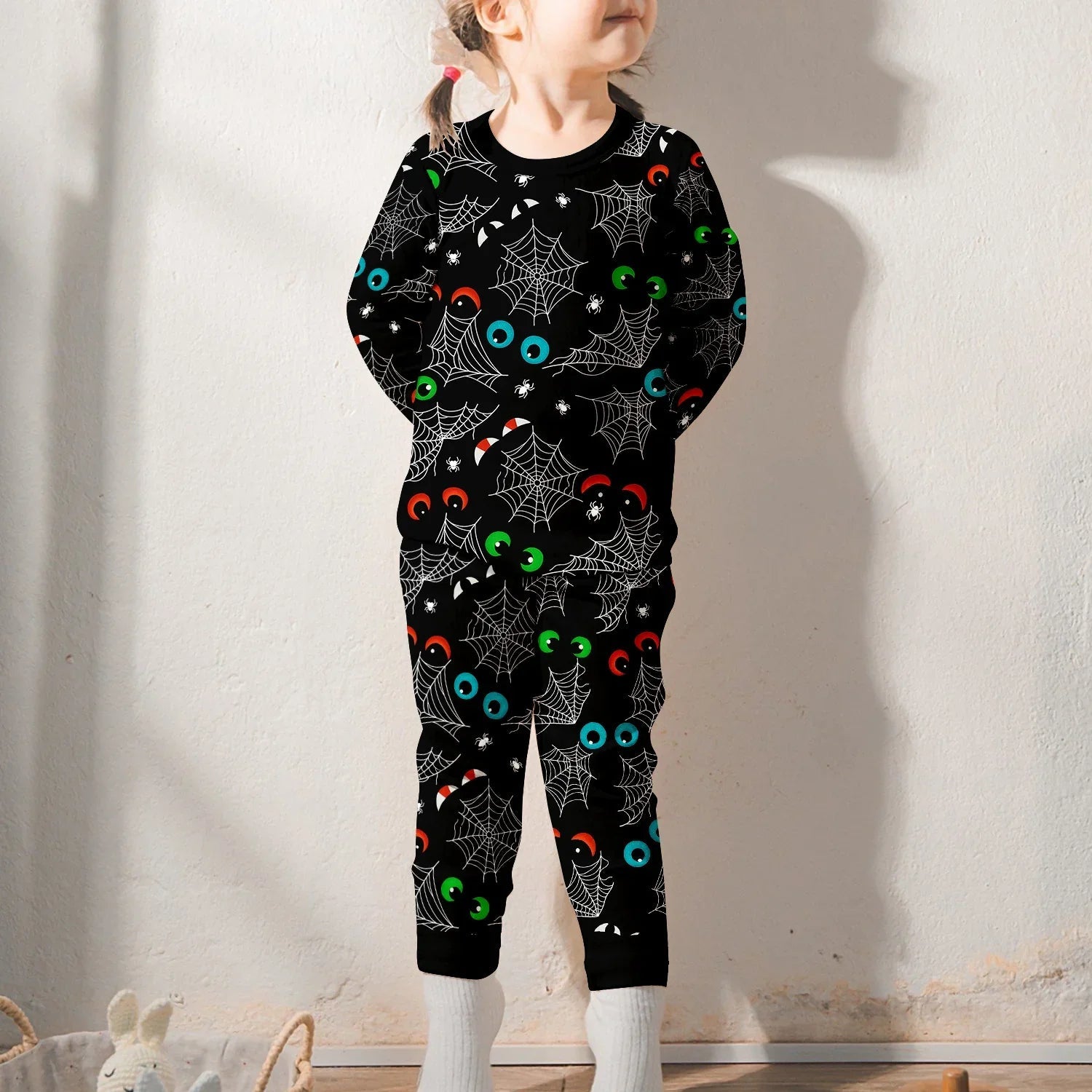 Im Dunkeln leuchtendes, gruseliges Spinnennetz-Pyjama-Set mit langen Ärmeln