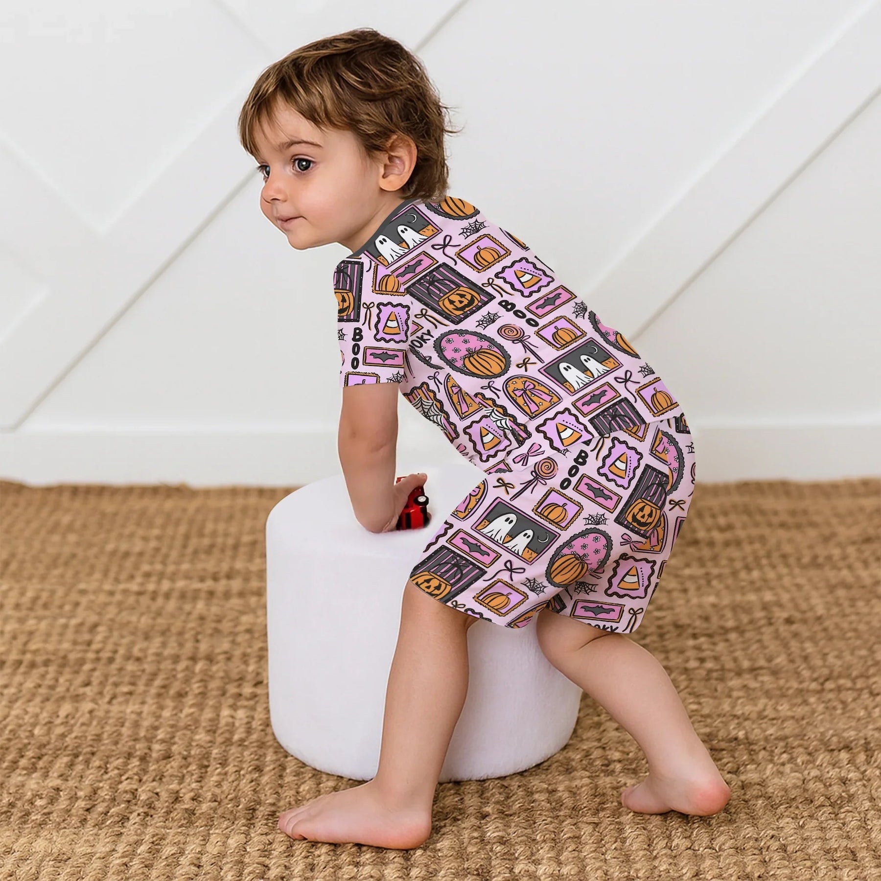 Machen Sie es sich mit einem Hauch von Halloween-Magie in unseren Bambus-Zippies und -Pyjamas „ Spooky Frames“ gemütlich. Hergestellt aus seidig weichem, atmungsaktivem Bambusgewebe, bieten diese Pyjamas den Kleinen das ganze Jahr über ein angenehmes Tragegefühl. Das verspielte Design mit Kürbissen, Geistern und gruseligen Rahmen sorgt für festlichen Charme und ist gleichzeitig sanft zu empfindlicher Haut. Dehnbar, gemütlich und perfekt für Halloween oder das ganze Jahr über.