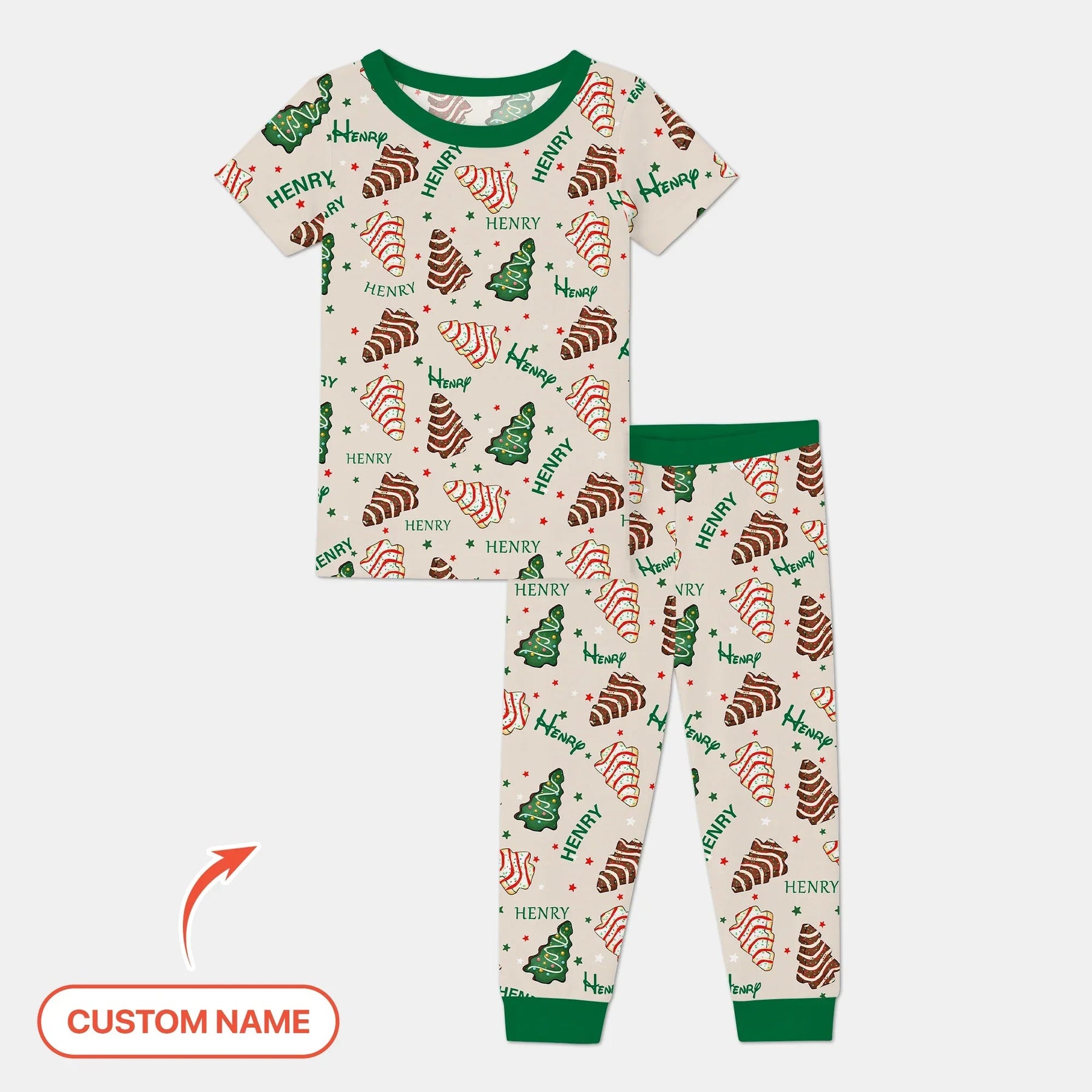 Christmas Tree Cake Custom Name Two Piece Short Sleeve Pajama Set - Zumbamboo