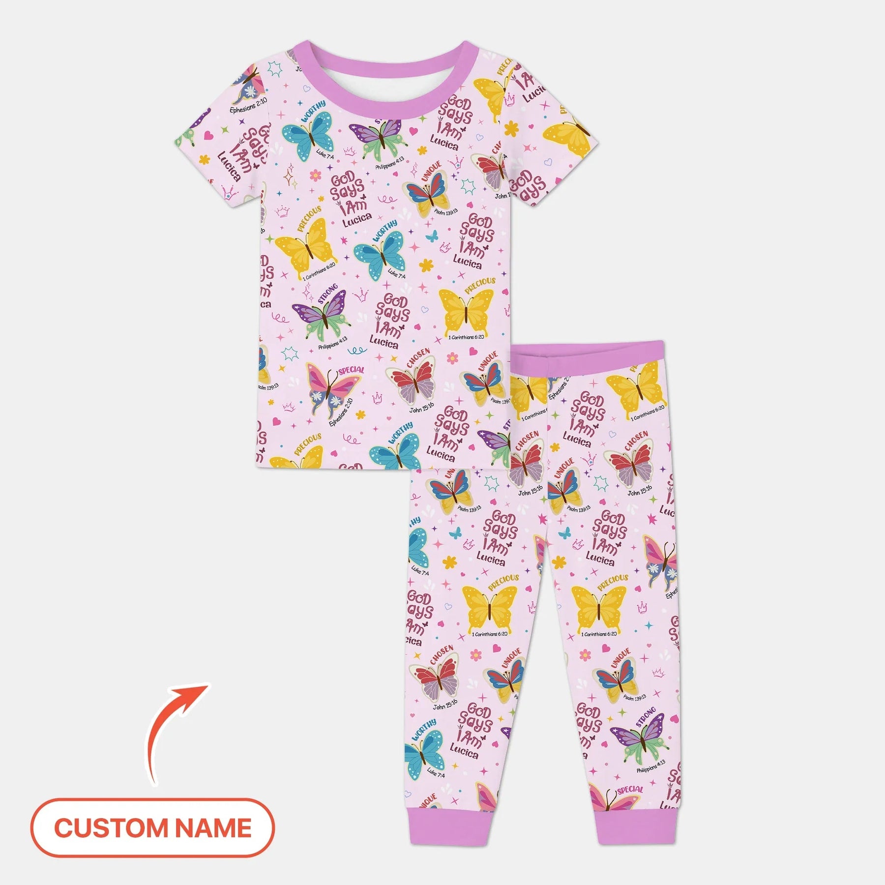 God Says I Am Custom Name GirlTwo Piece Short Sleeve Pajama Set - Zumbamboo