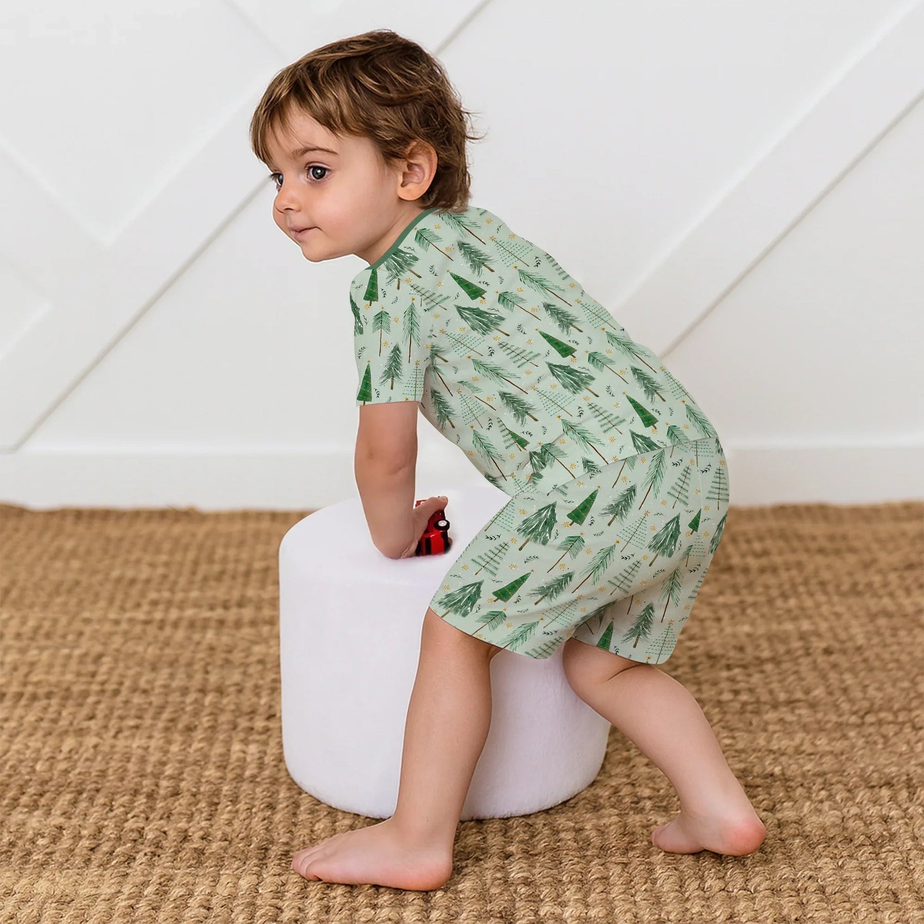 Grünes, zweiteiliges Pyjama-Set mit kurzärmligen Shorts und Weihnachtsbaum-Farm