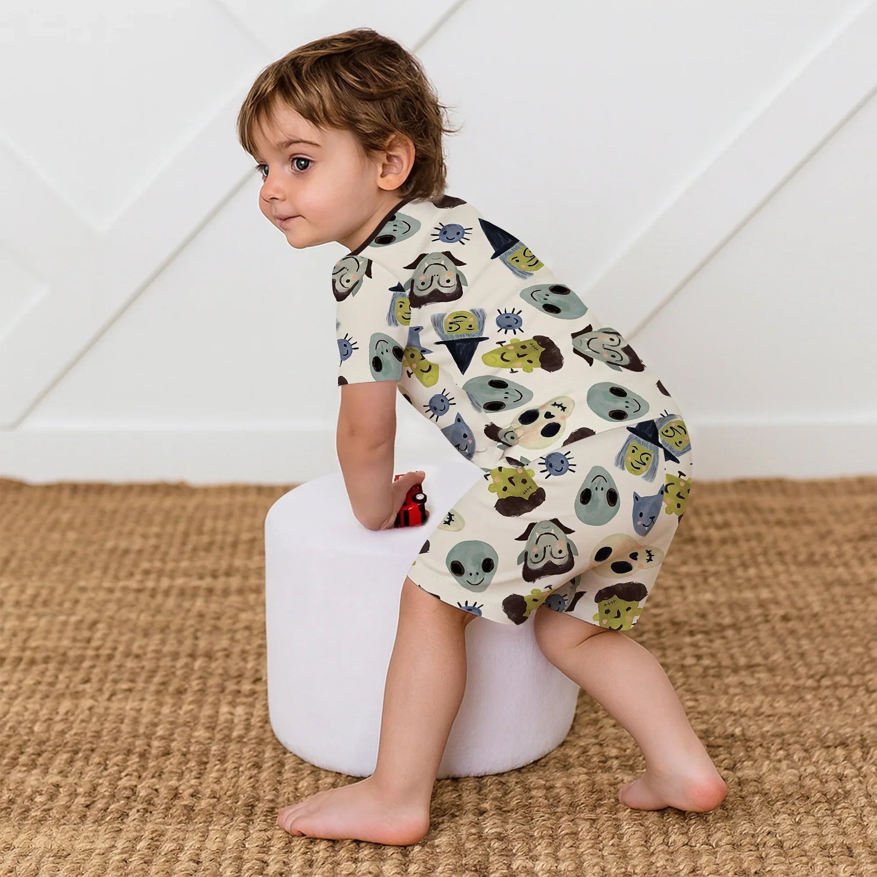 Feiern Sie die gruselige Jahreszeit bequem mit unseren Bambus-Zippies und -Pyjamas „Halloween Faces“. Hergestellt aus butterweichem, atmungsaktivem Bambusgewebe, halten diese Pyjamas die ganze Nacht über die Kleinen kuschelig und kühl. Das verspielte Muster mit Hexen, Totenköpfen, Katzen und freundlichen Monstern sorgt für festlichen Halloween-Charme und ist gleichzeitig sanft zu empfindlicher Haut. Dehnbar, bequem und perfekt für süße Gruselträume.