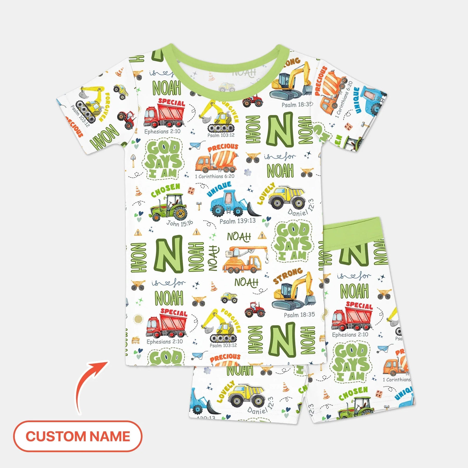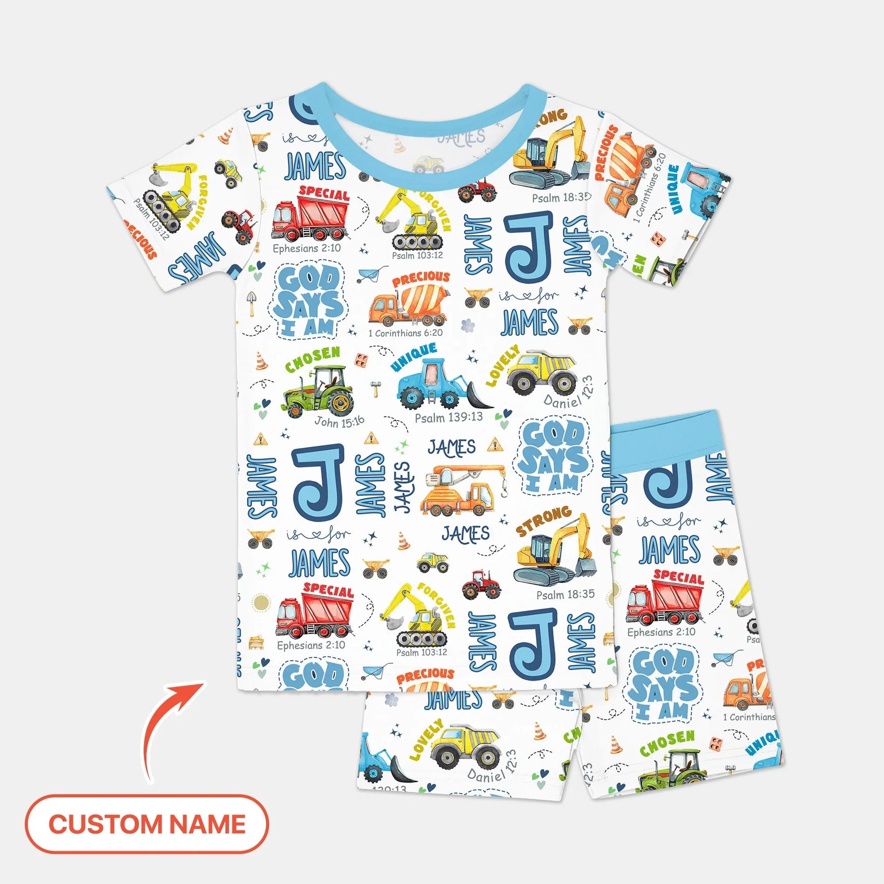 Personalized God Says I Am Construction Vehicules Two Piece Short Sleeve Shorts Pajama Set - Zumbamboo