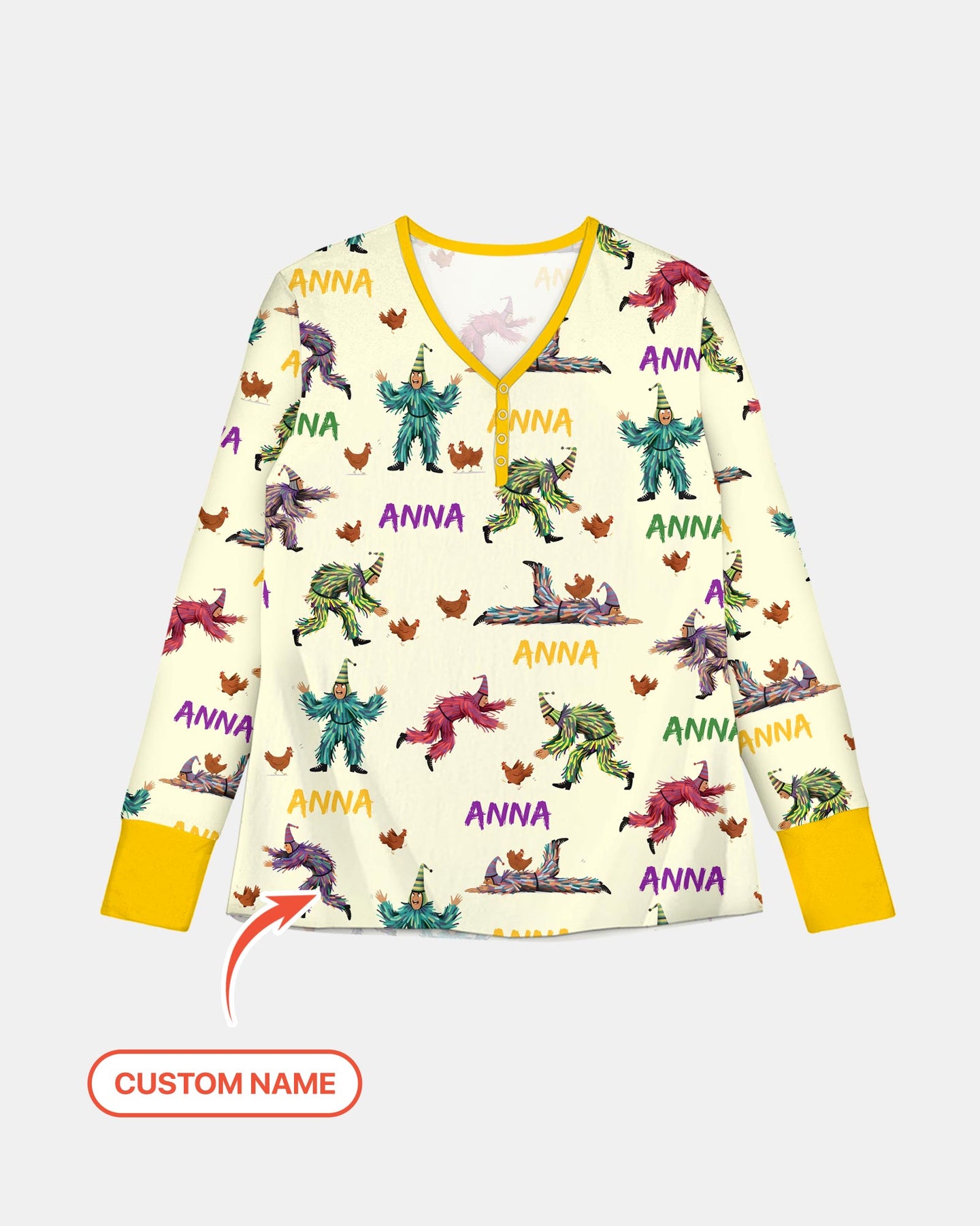 This artwork brings the joyful spirit of traditional Mardi Gras chicken chasing into sleepwear for kids and parents, blending culture, fun, and festive energy into cozy, everyday comfort.