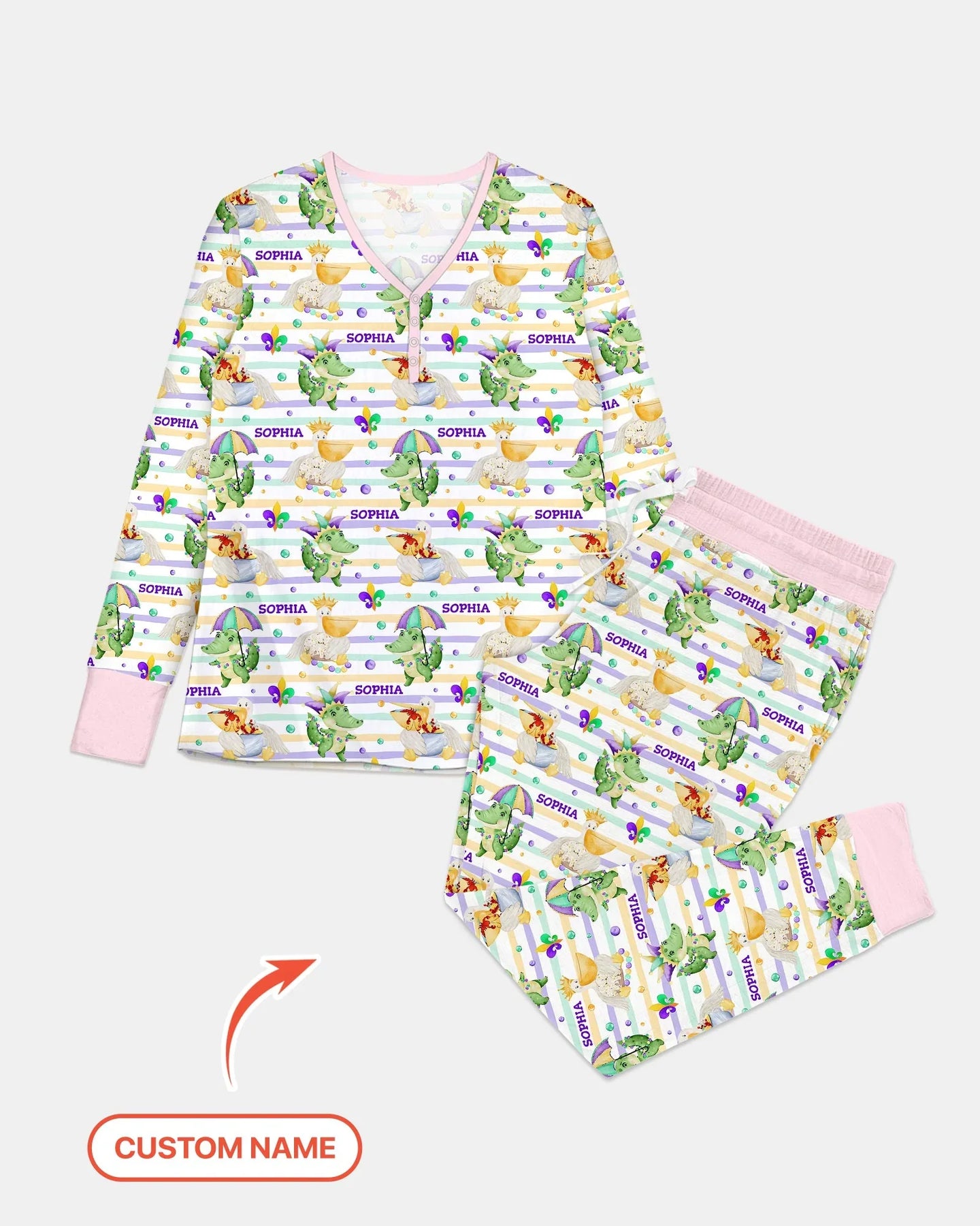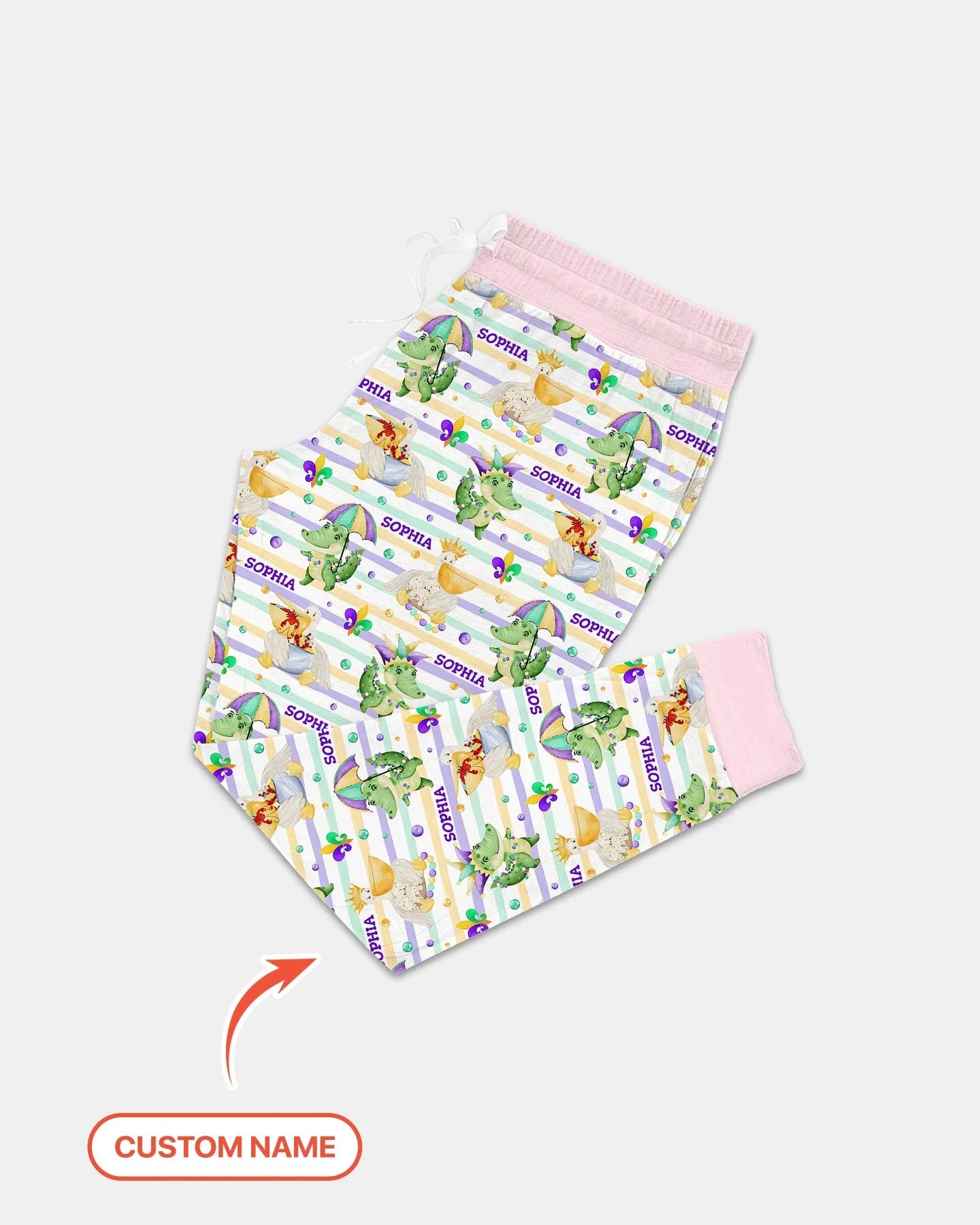 This artwork brings the playful Mardi Gras spirit into sleepwear for kids and parents, featuring whimsical characters, festive colors, and a custom name. It blends tradition and fun into cozy bedtime comfort, making every night feel like a celebration