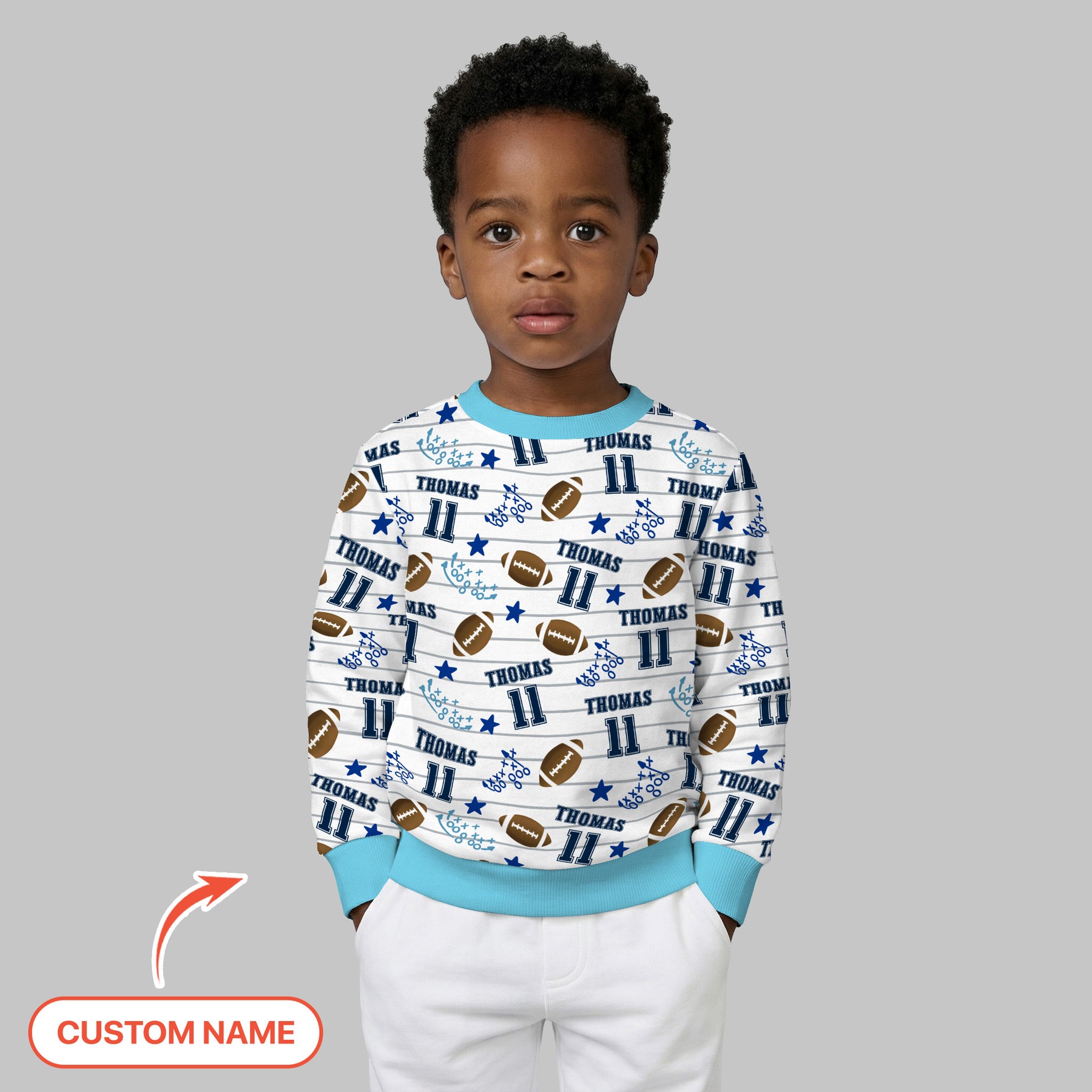 Get ready for kickoff cuddles! This sporty and adorable print features footballs, playbook doodles, stars, jersey numbers, and—best of all—your little MVP’s name. Perfect for tiny fans who love cheering, running, and snuggling in style.