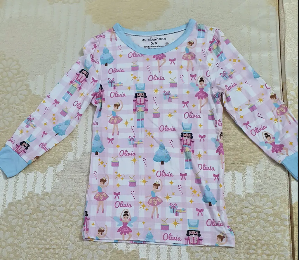 This pajama set brings a classic holiday feel that’s both cozy and charming. The Nutcracker-themed design is elegant and festive without being too bold, and the custom name detail makes it feel extra special. The long sleeves and soft fabric are perfect for keeping kids warm on cooler nights. The material feels smooth and comfortable, and the print quality stays beautiful even after washing. It’s a lovely choice for holiday sleepwear and seasonal photos.