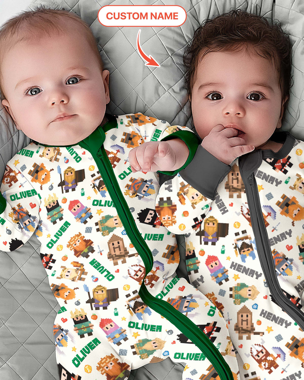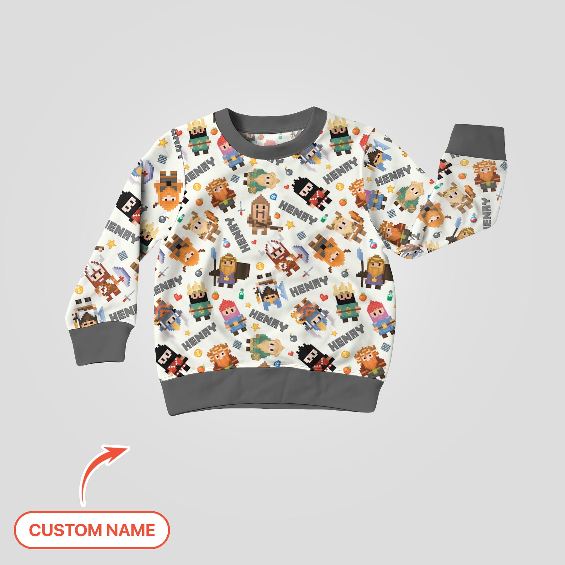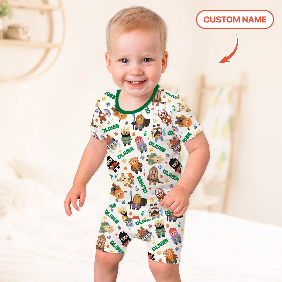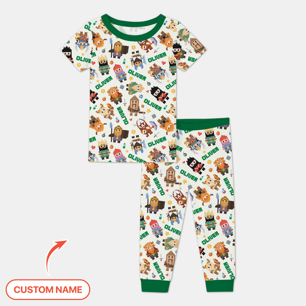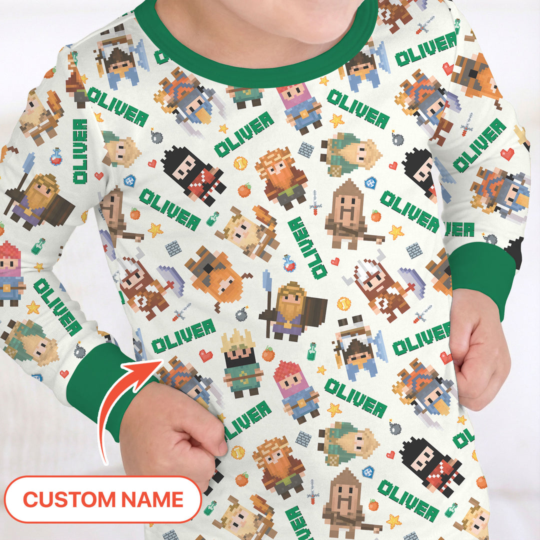 Inspired by retro video-game charm, this lineup features adorable pixel heroes—knights, wizards, adventurers, and mighty warriors—all brought to life in bright blocky style. Each outfit is personalized with your child’s name, making their adventure feel truly their own.