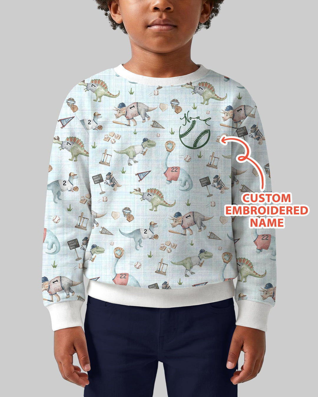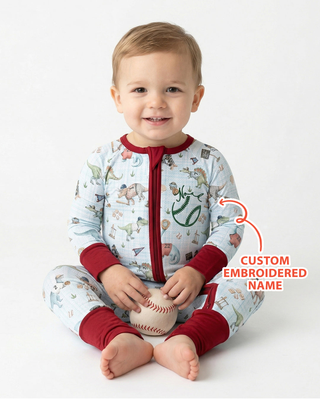 Custom Embroidered Dinosaurs Baseball Bamboo Two Piece Long Sleeve Pajama Set