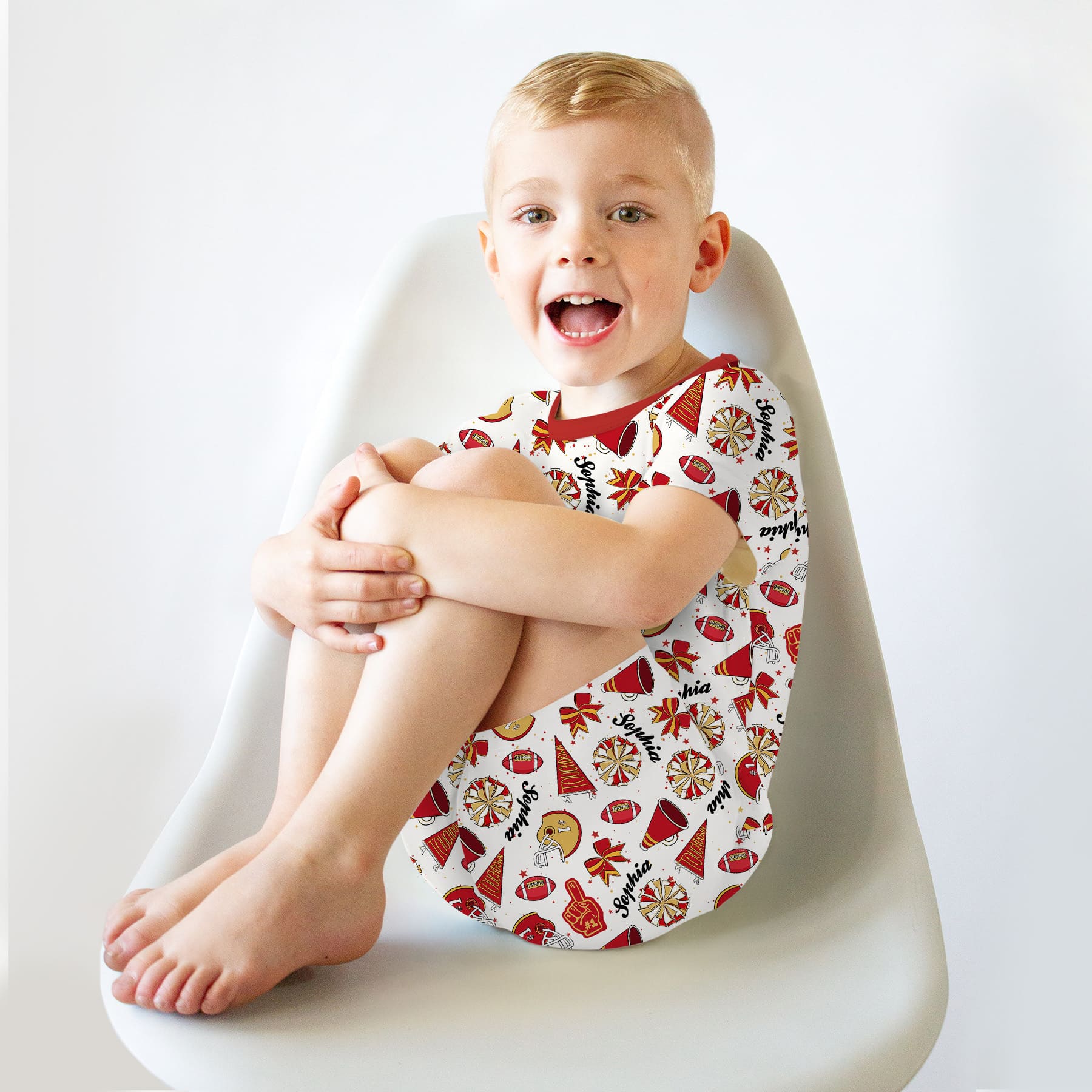 This spirited print is filled with pom-poms, helmets, megaphones, bows, footballs, and your child’s very own name—perfect for little fans who love cheering loud and proud! The playful mix of red and gold makes every sleep, play, or lounge moment feel like a game-day celebration.