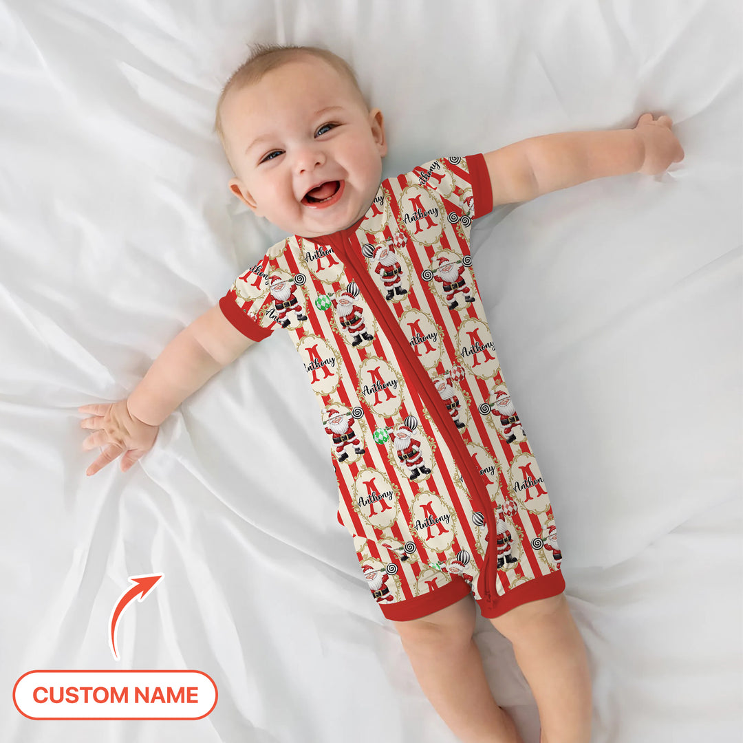 Ho-ho-holiday dreams start here! This festive red-and-cream stripe print features jolly Santas, candy details, and your little one’s name for a magical personalized touch. Made from buttery-soft bamboo fabric, these zippies and PJs are cozy, breathable, and perfect for Christmas cuddles and morning photos! ❤️🎄