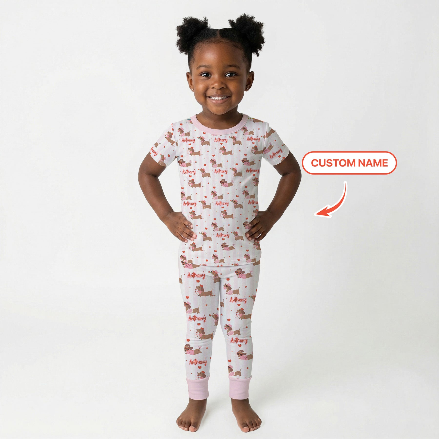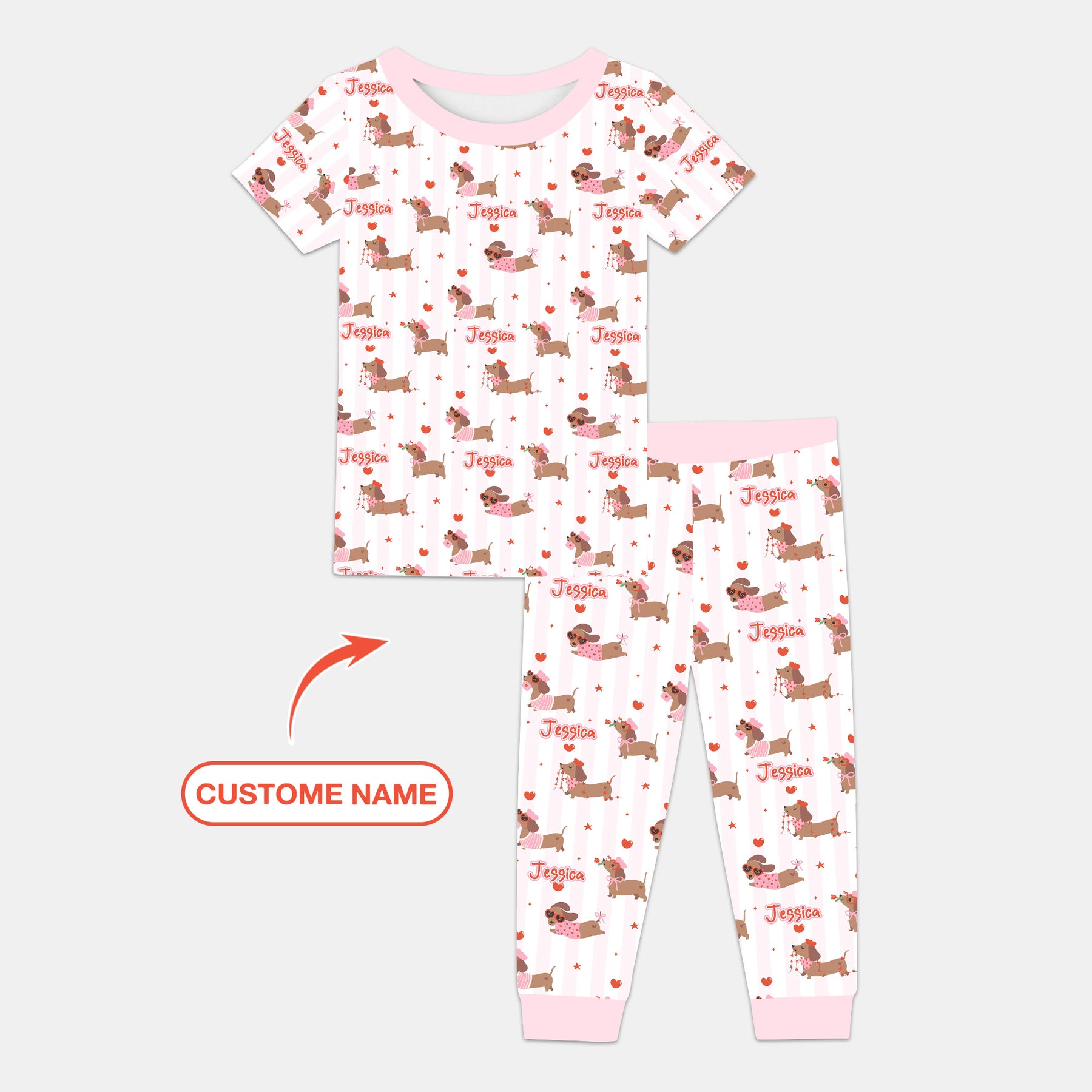 Custom Name Valentine Dachshund Family Matching Two Piece Short Sleeve Pajama Set