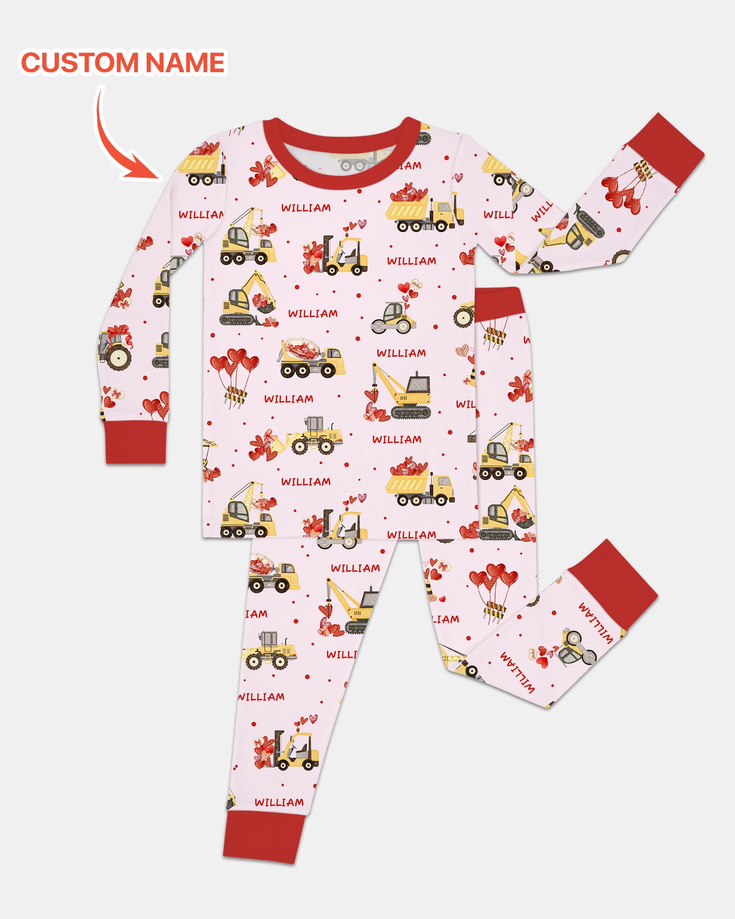 Custom Name Valentine Trucks Family Matching Two Piece Long Sleeve Pajama Set