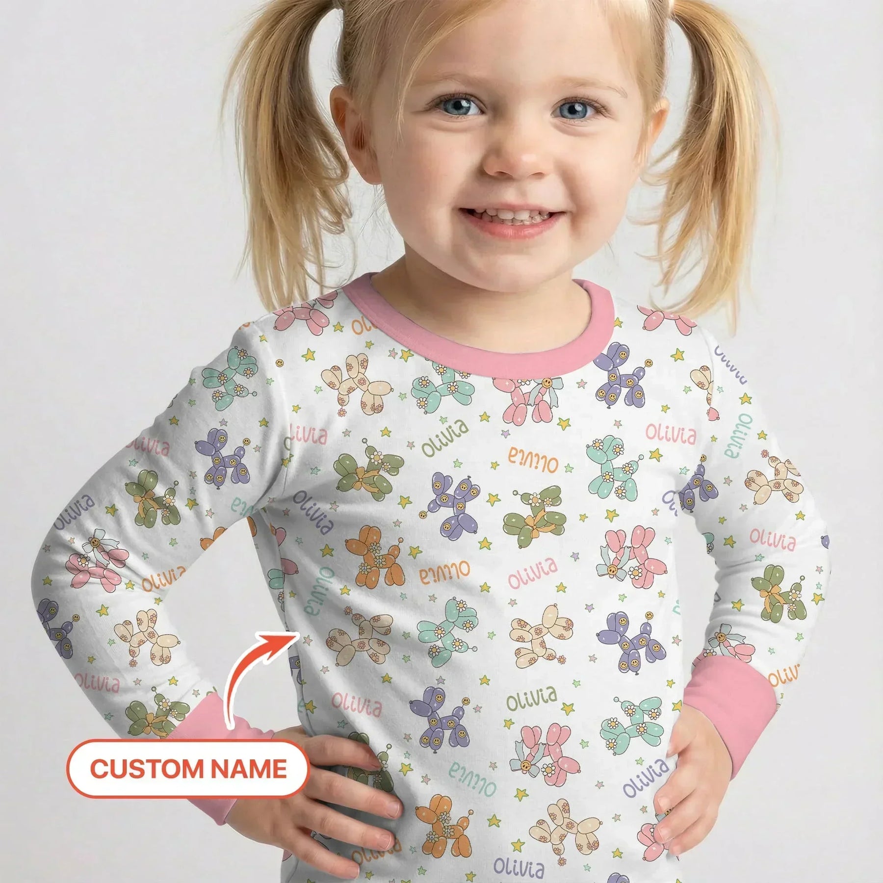 Custom Name Balloon Dog Two Piece Long Sleeve Pajama Set