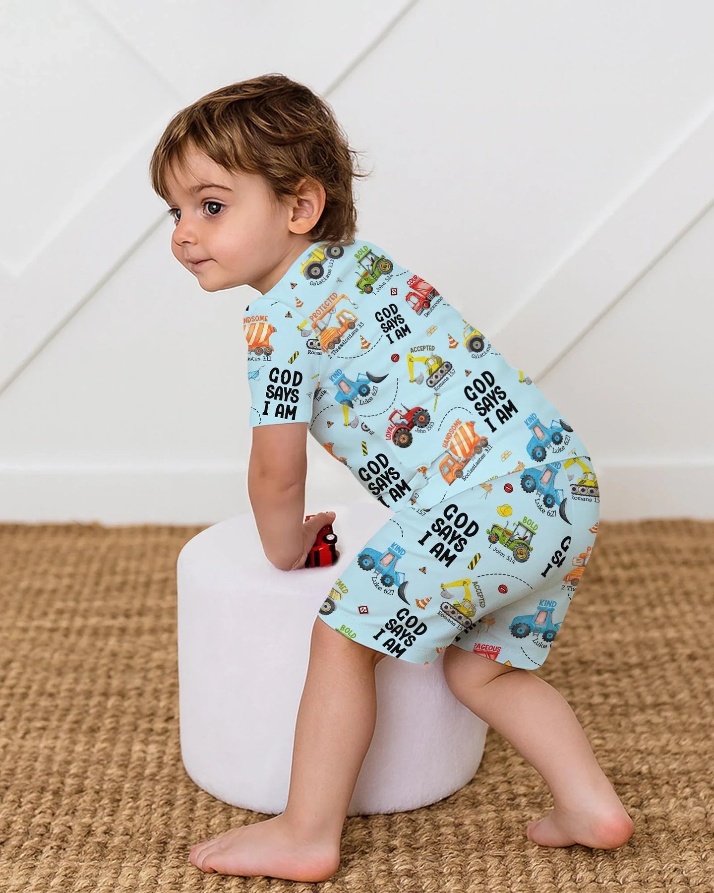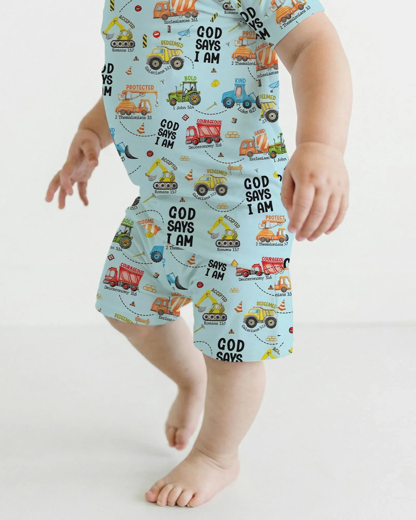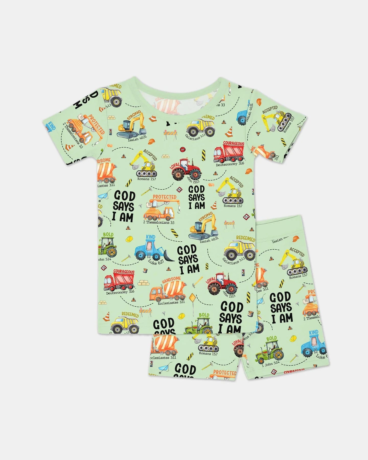 Gear up for faith-filled fun with our “God Says I Am” Construction Collection! These bamboo pajamas for babies and kids are packed with bright, playful trucks and uplifting Bible affirmations—reminding little ones of their strength, courage, and worth in God’s eyes. Made from ultra-soft, breathable bamboo fabric, they’re perfect for active days, cozy nights, and every joyful moment in between.