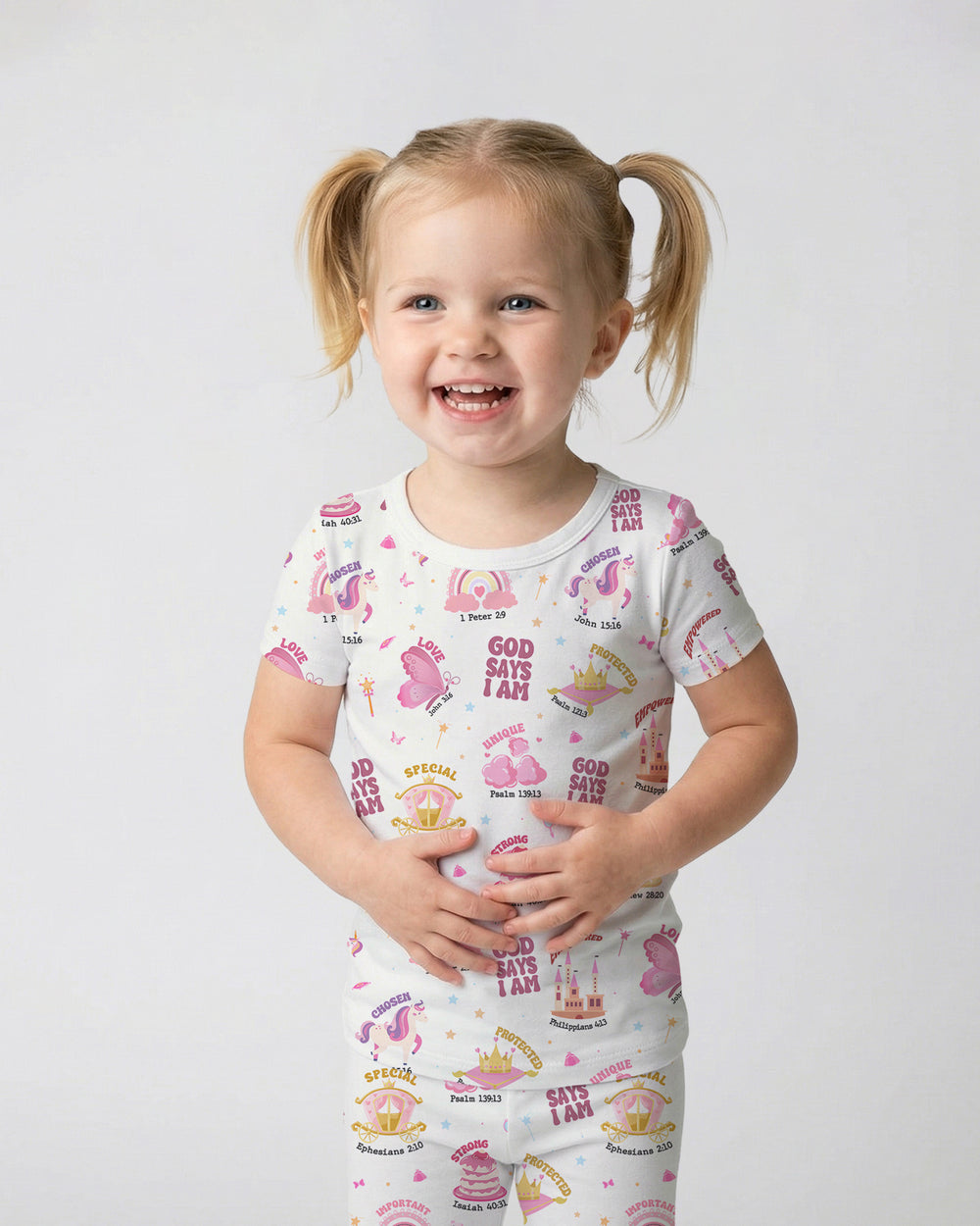 CHOSEN unicorns, PROTECTED crowns, UNIQUE rainbows, and STRONG birthday cakes, this dreamy princess print surrounds your little royal with uplifting words and cloud-soft bamboo for the sweetest, most magical sleep.