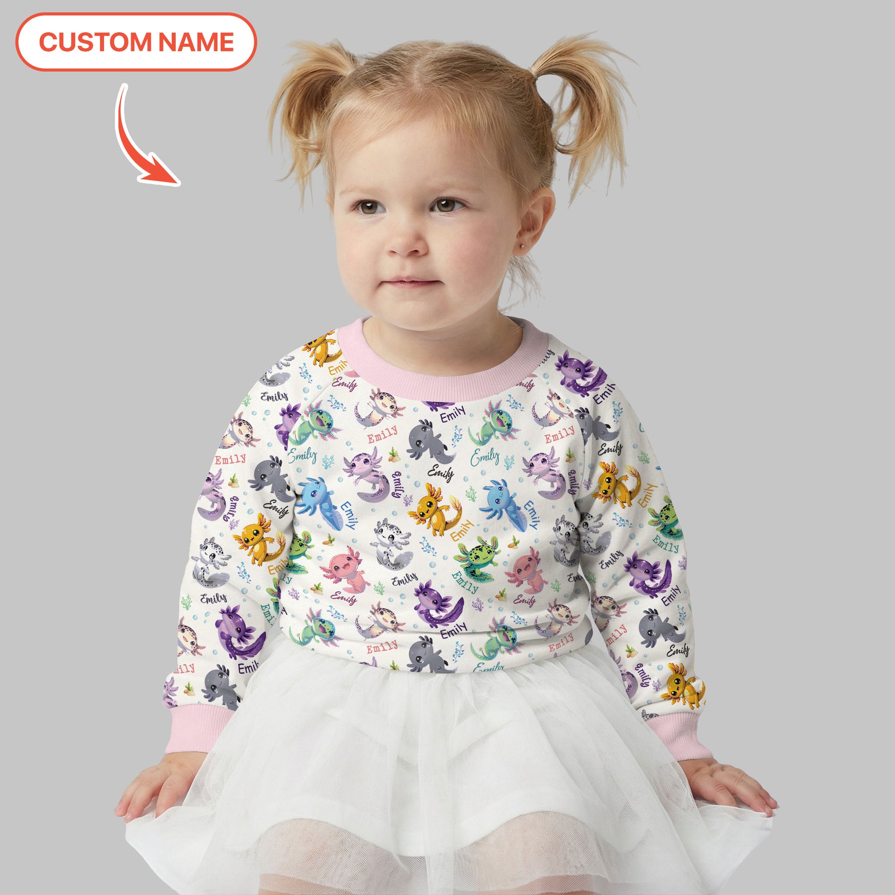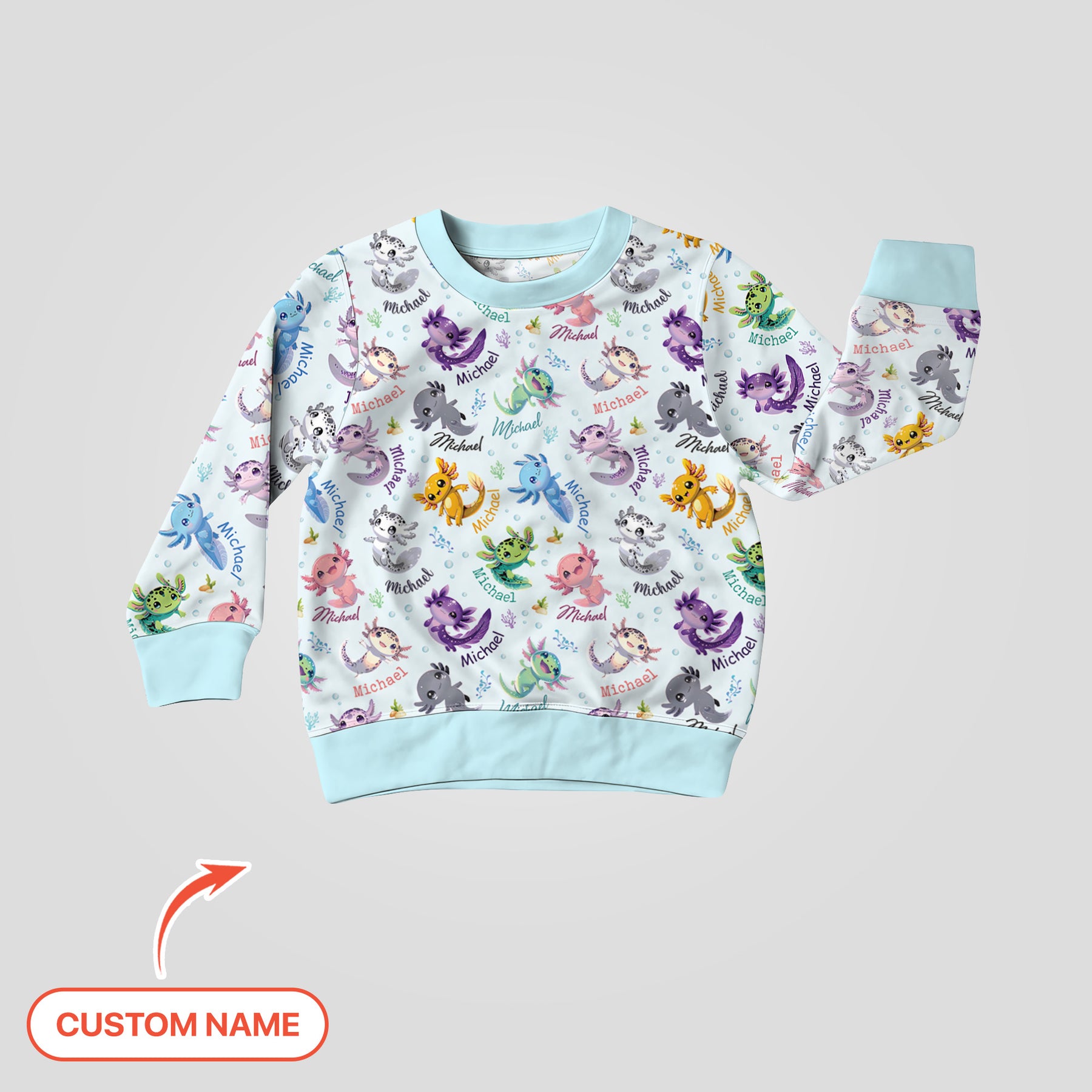 Add your child’s custom name for a personal touch that makes each piece uniquely theirs. The cute swimming axolotls, soft pastel tones, and gentle ocean elements create a sweet, whimsical world perfect for babies and toddlers.