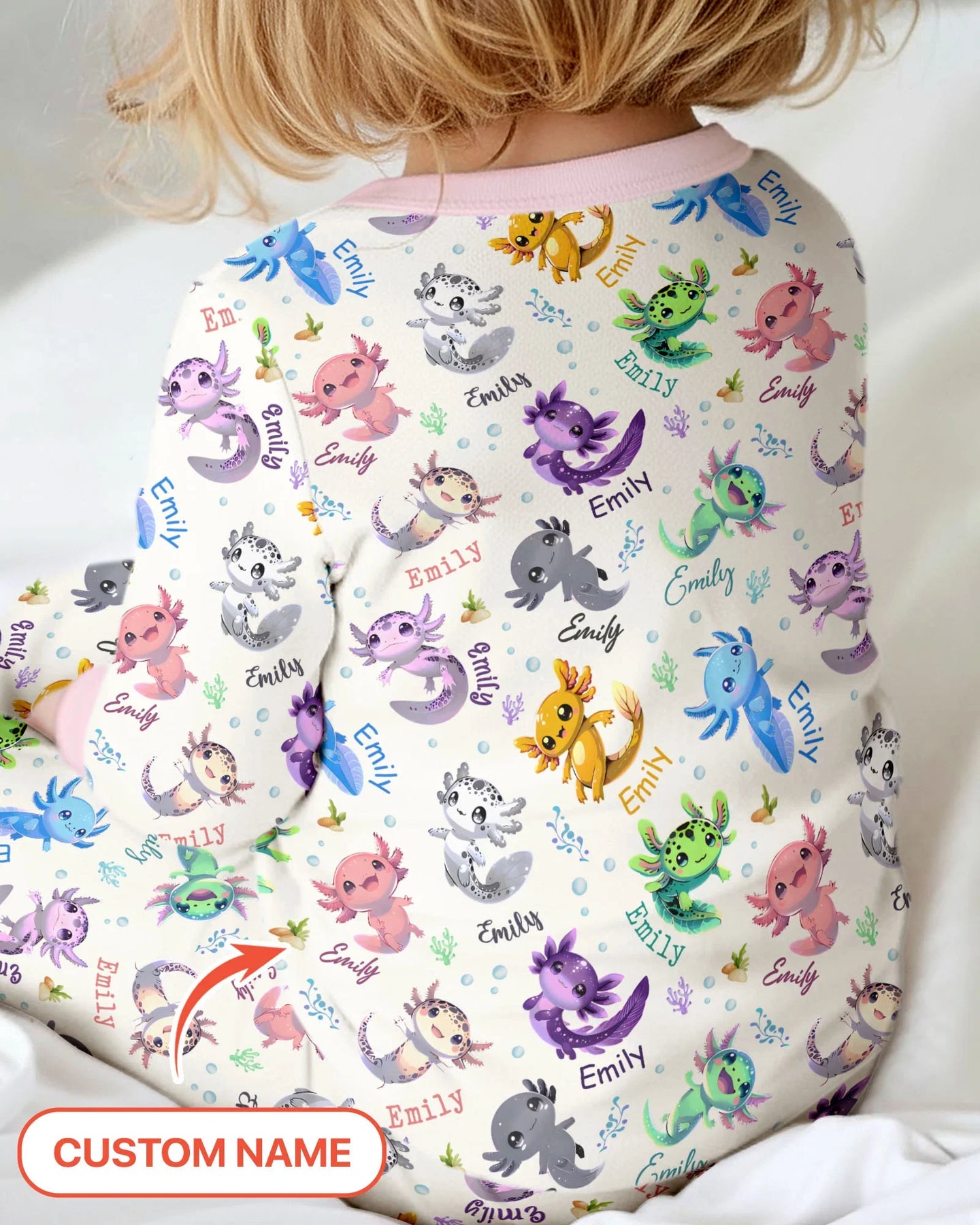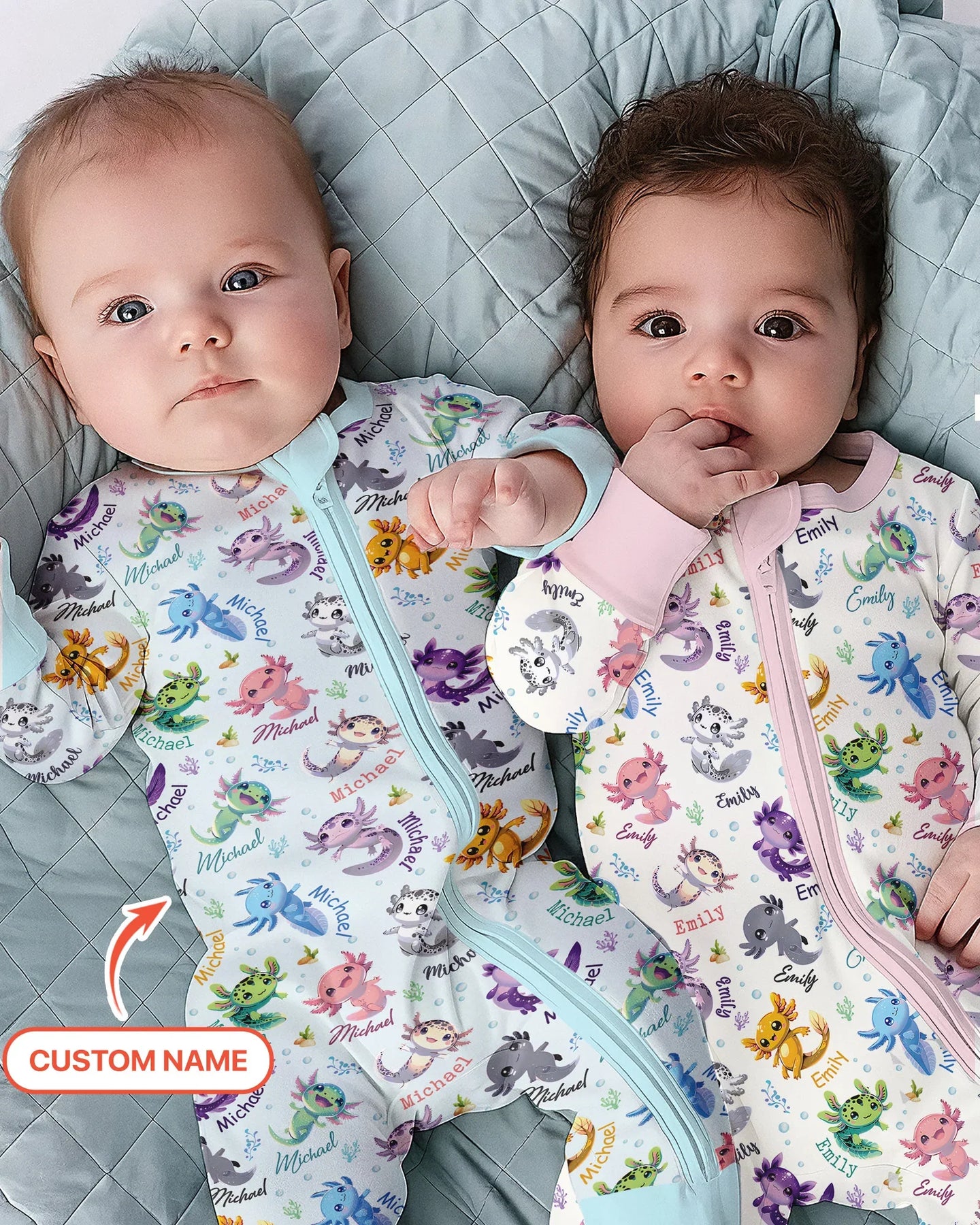 Add your child’s custom name for a personal touch that makes each piece uniquely theirs. The cute swimming axolotls, soft pastel tones, and gentle ocean elements create a sweet, whimsical world perfect for babies and toddlers.