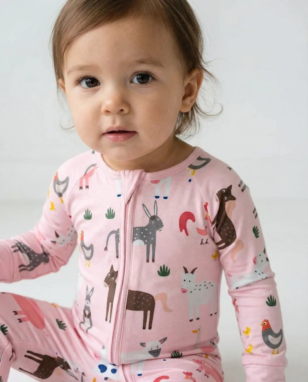 Experience farmyard fun with our Farm Animals (Pink) Two-Piece Pajama Set. The cute animal prints and bamboo viscose fabric make this set a charming and comfortable choice for bedtime. The soft, breathable material is perfect for sensitive skin and suitable for all seasons. The design includes no snaps, buttons, or interior tags, ensuring maximum comfort and ease of wear.