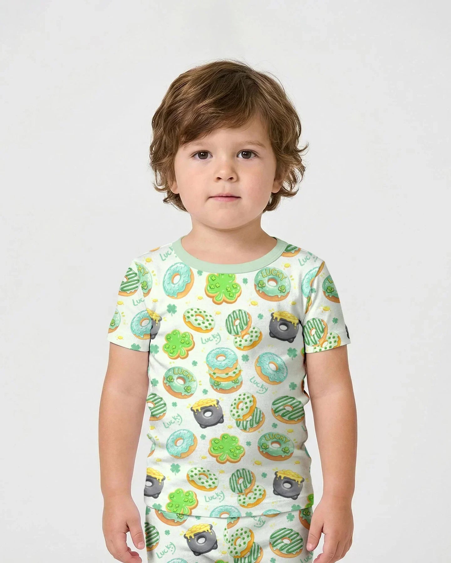 A festive Happy St. Patrick’s Day collection with playful shamrocks, lucky donuts, and cheerful green tones, made from soft, breathable fabric—perfect for cozy sleepwear and mix-and-match styles kids will love all season long.