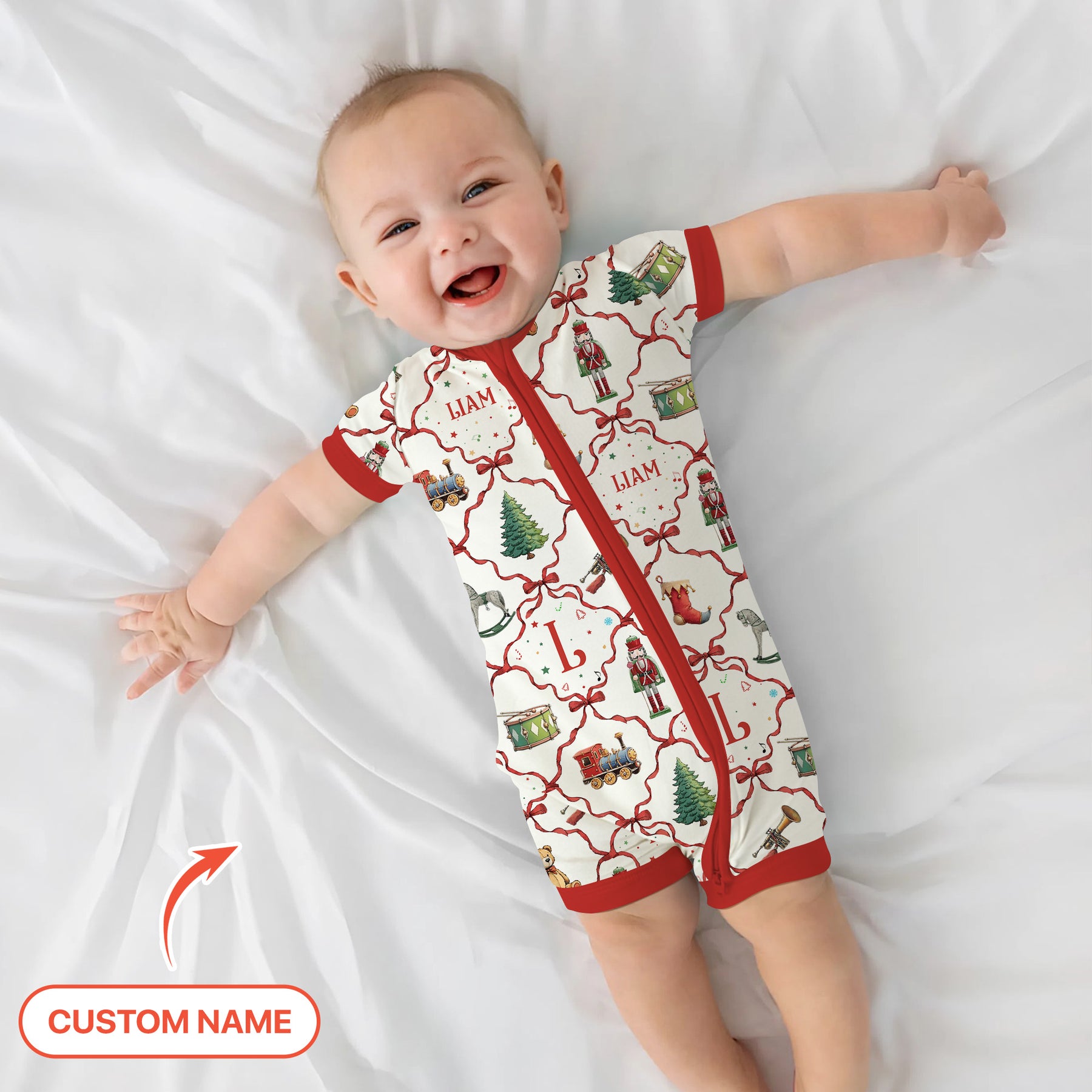 Step back into a world of classic holiday charm with our Vintage Christmas Toy Custom Name Collection — where nostalgia meets festive coziness. This heartwarming pajama design brings together timeless Christmas icons: toy drums, dolls, bunnies, ornaments, and pine trees — all delicately framed in a vintage red ribbon pattern that feels like a page from an old-fashioned storybook.