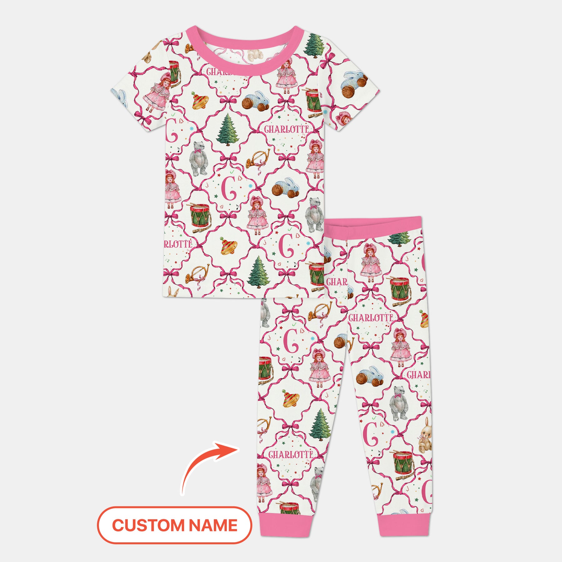 Vintage Christmas Toy Custom Name Girl Two Piece Short Sleeve Pajama Set
